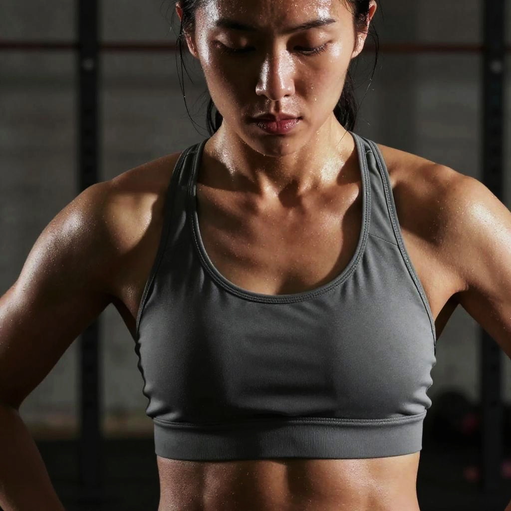 Close-up sports bra candid image of an athlete mid-training at a gritty urban gym, intense focus, beads of sweat, textured skin, detailed fabric stretch, muted industrial background, chiaroscuro lighting highlighting muscular definition