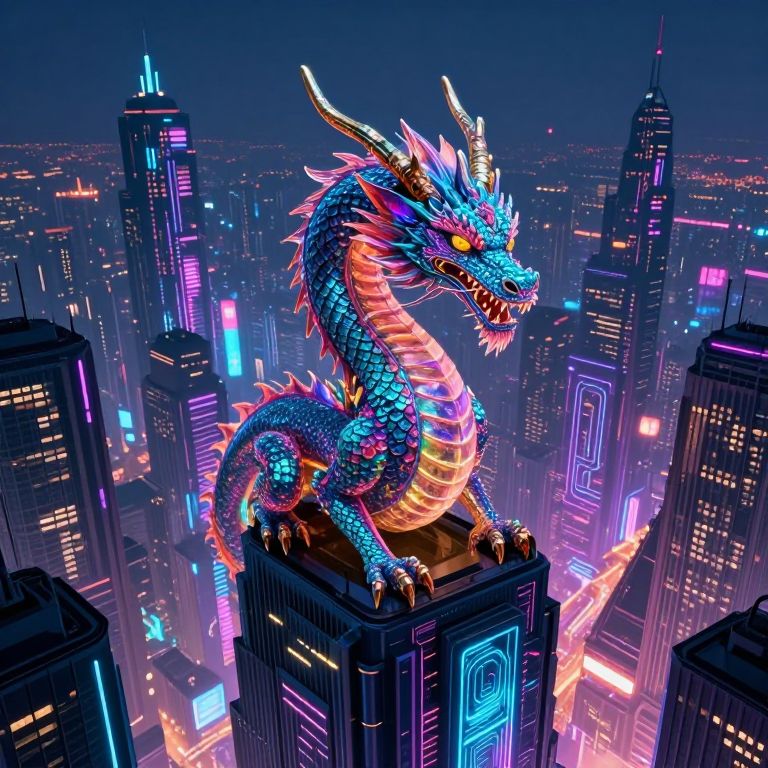 Digital artwork of a vibrant, neon-blue dragon with pink and orange scales perched on a skyscraper in a futuristic, neon-lit cityscape at