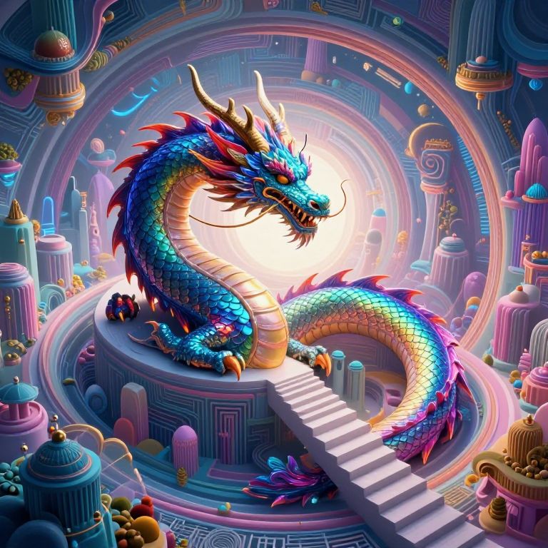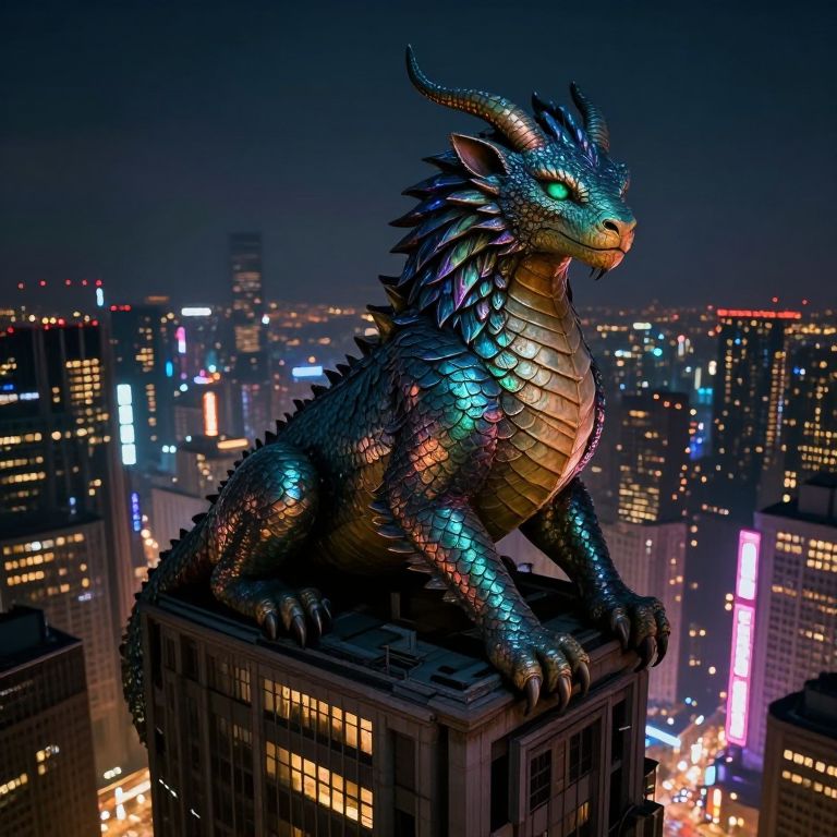 A majestic dragon rests on top of an immense skyscraper in a bustling cyberpunk metropolis, its scales glowing with iridescent colors reminiscent of a surreal dreamscape. The dragon's intense gaze reflects the chaotic neon lights below as it surveys the futuristic panorama from its elevated perch, evoking wonder and intrigue as it merges seamlessly with the intricate patterns of towering structures and the luminous tapestry of advanced technology and organic elements interwoven in a captivating visual masterpiece.