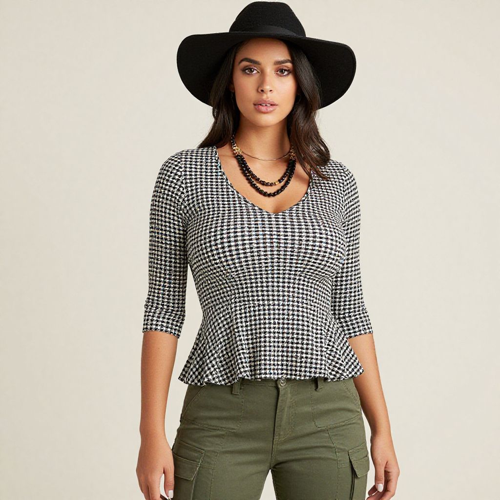"Woman, casual, houndstooth patterned top with a v-neckline, elbow-length sleeves, fitted at the waist and flaring out at the hips, olive green slim-fit trousers with cargo pocket detail, wide-brimmed felt hat, black layered bead necklace.. Sexy. Pretty face and beаutiful eyes. Big breasts."