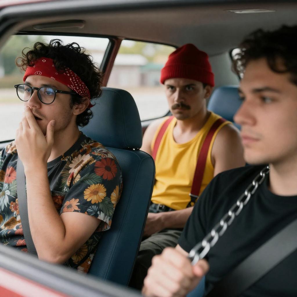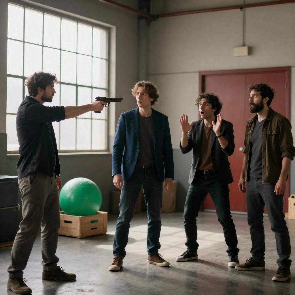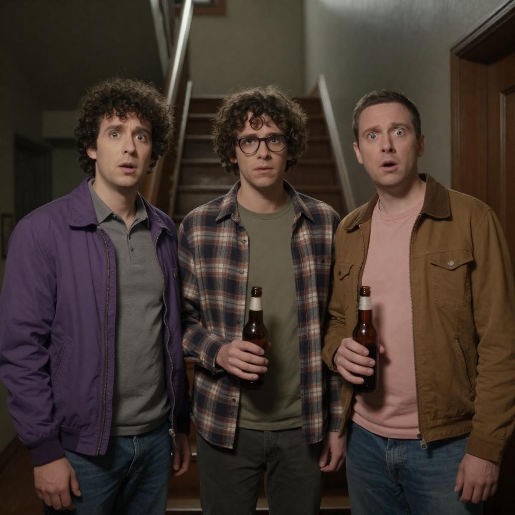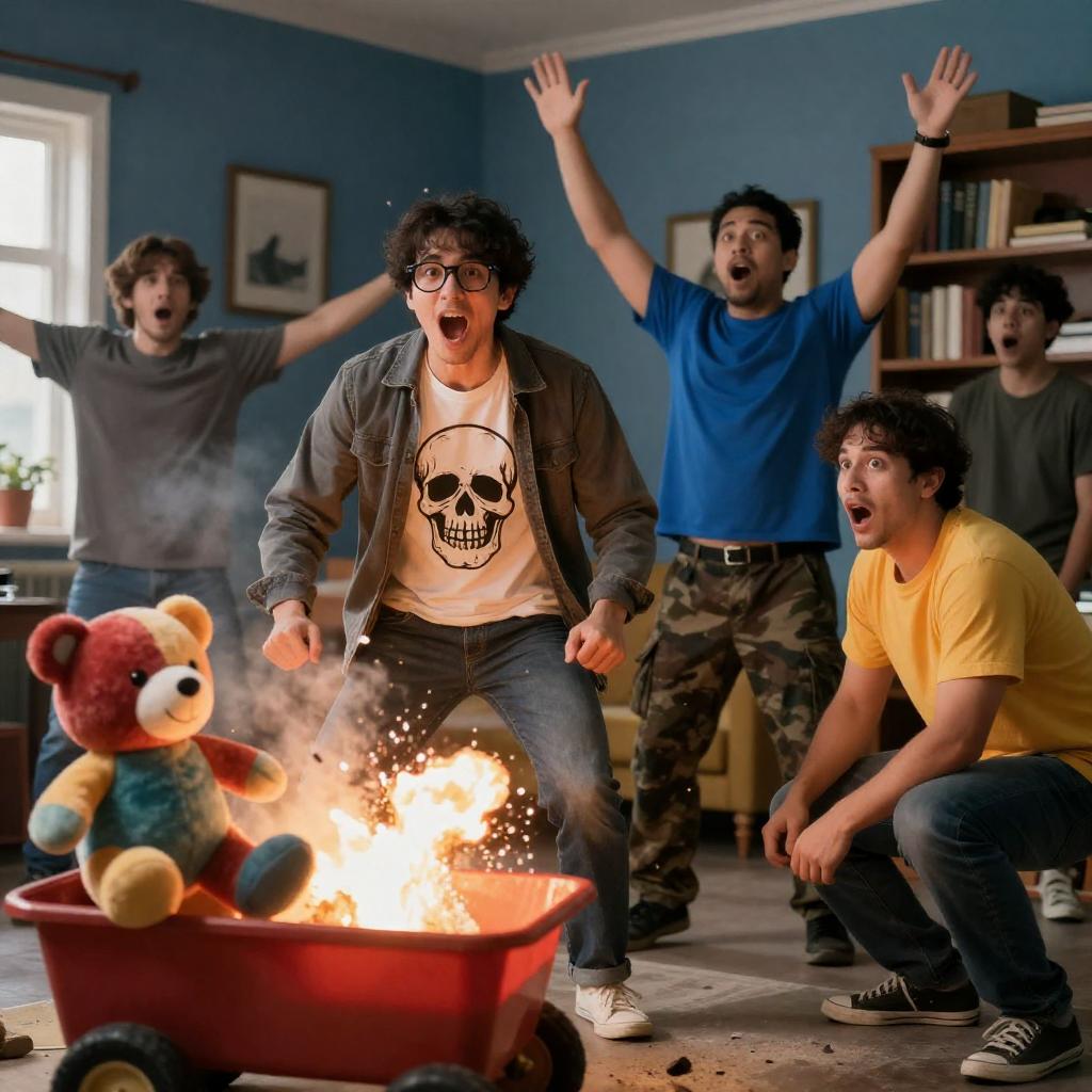 Photograph of six men reacting to an explosion. Central man in glasses, gray jacket, white shirt with skull design, shouting. Man in blue shirt, green camouflage pants, right of center, arms raised. Man in yellow shirt, right foreground, crouching. Man with brown hair, gray shirt, background, arms out. Colorful stuffed animal on table, left foreground. Red cart in front, explosion with debris. Blue walls, framed pictures, bookshelf. Men's expressions intense, shocked.