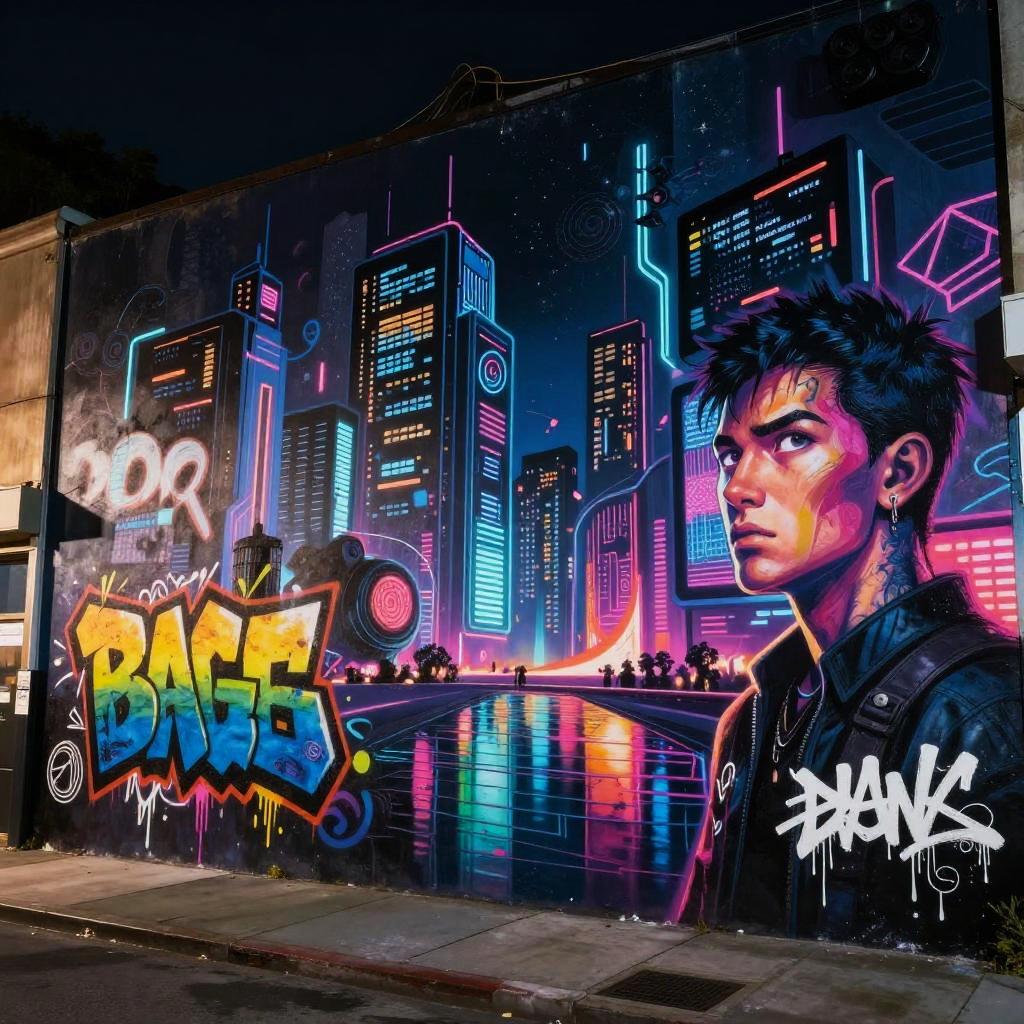 Visual art AI illustrating a cyberpunk city mural where digital screens come alive with animated graffiti, neon hues contrasting with dark urban textures, reflective surfaces and intricate futuristic details, dynamic composition, night setting
