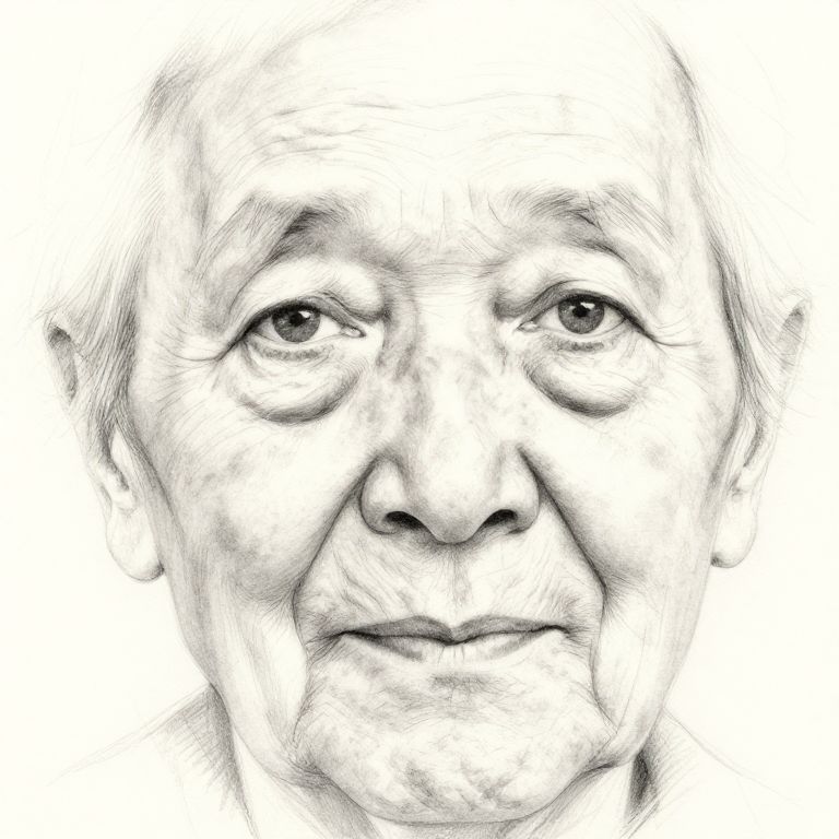 Photo drawing filter artistic adaptation of a close-up portrait of an elderly person, focusing on expressive wrinkles and eyes using delicate pencil strokes and softly blended shadows, evoking emotion and storytelling through a hand-drawn aesthetic.