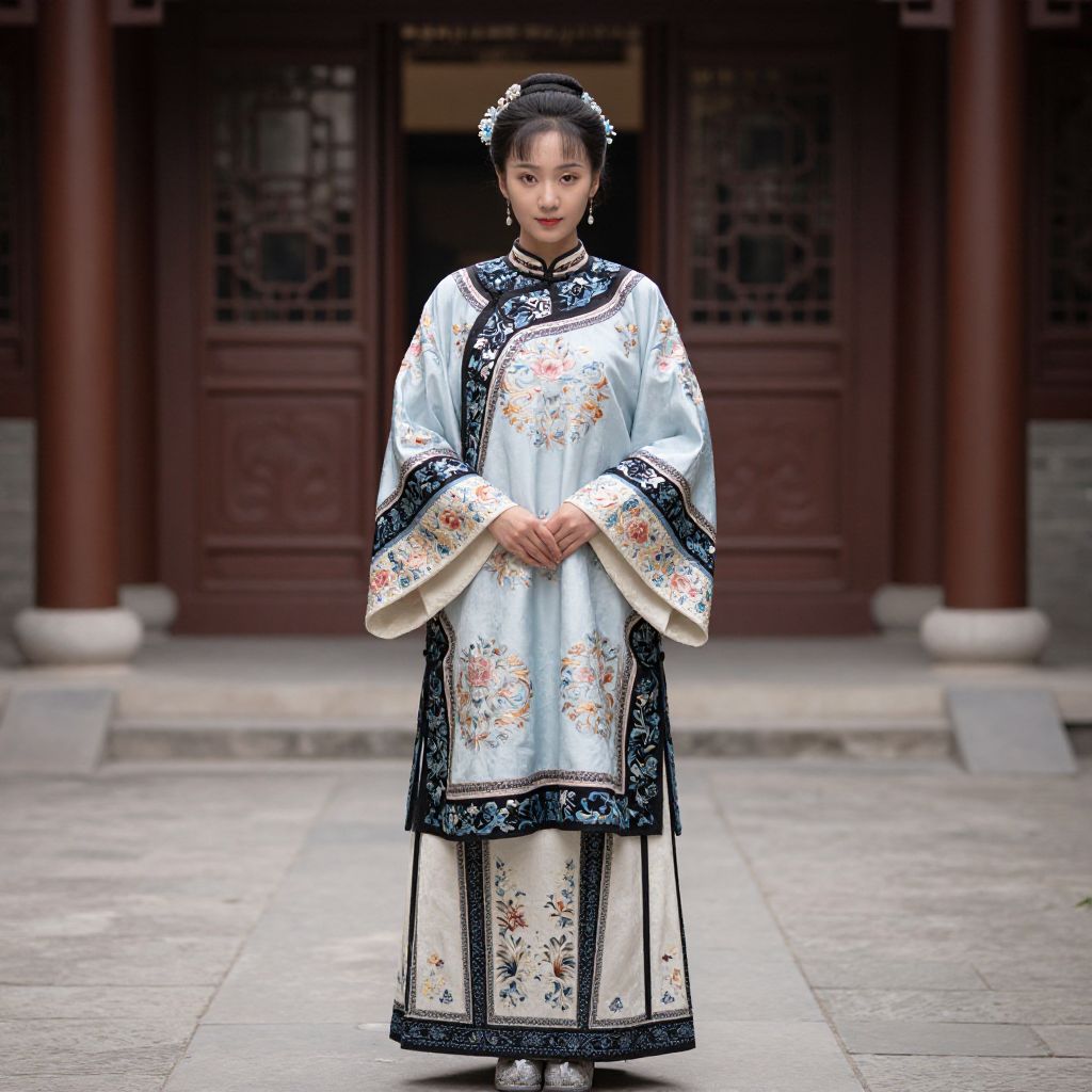 Bai qian costume, woman in a traditional chinese dress standing in a courtyard