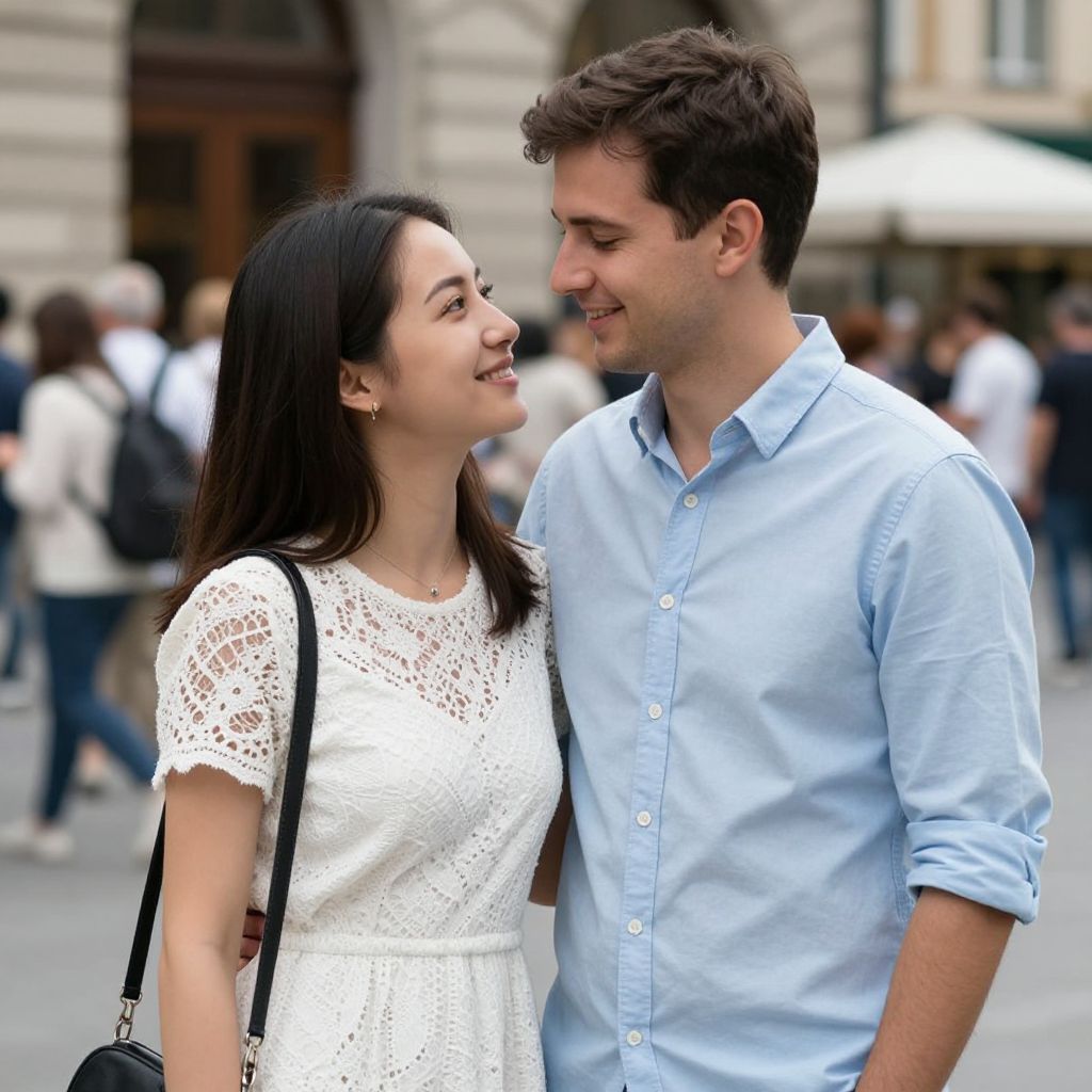 Photograph of a smiling couple standing close together outdoors. The woman, with long black hair and light skin, wears a white lace dress and a black shoulder bag. The man, with short brown hair and light skin, wears a light blue button-down shirt with sleeves rolled up. They are looking at each other affectionately. The background is blurred, showing a busy street with people and buildings, including a white umbrella and a stone facade. The lighting is natural, and the image has a slightly warm tone.