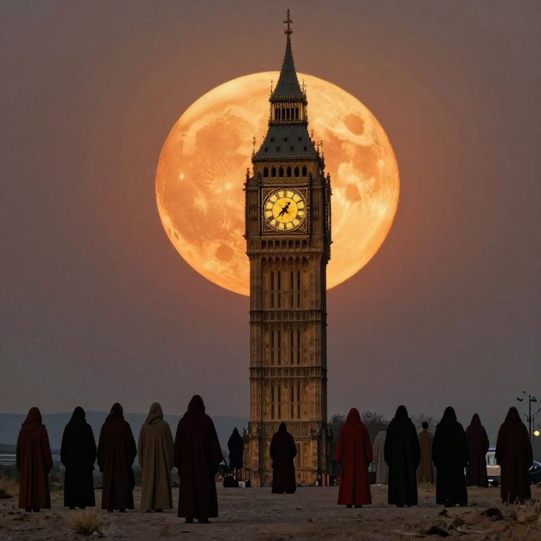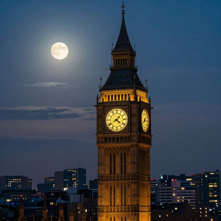A luminous clock tower stands defiantly against a twilight sky, its golden face glowing like a beacon of time, while the moon casts an ethereal light over a cityscape steeped in mystery and wonder.
