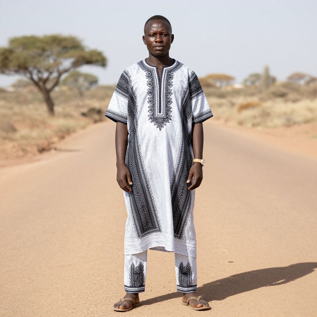 Photograph of a Black man standing on a sunlit, sandy African road, wearing a white and black patterned traditional African garment, brown sandals,