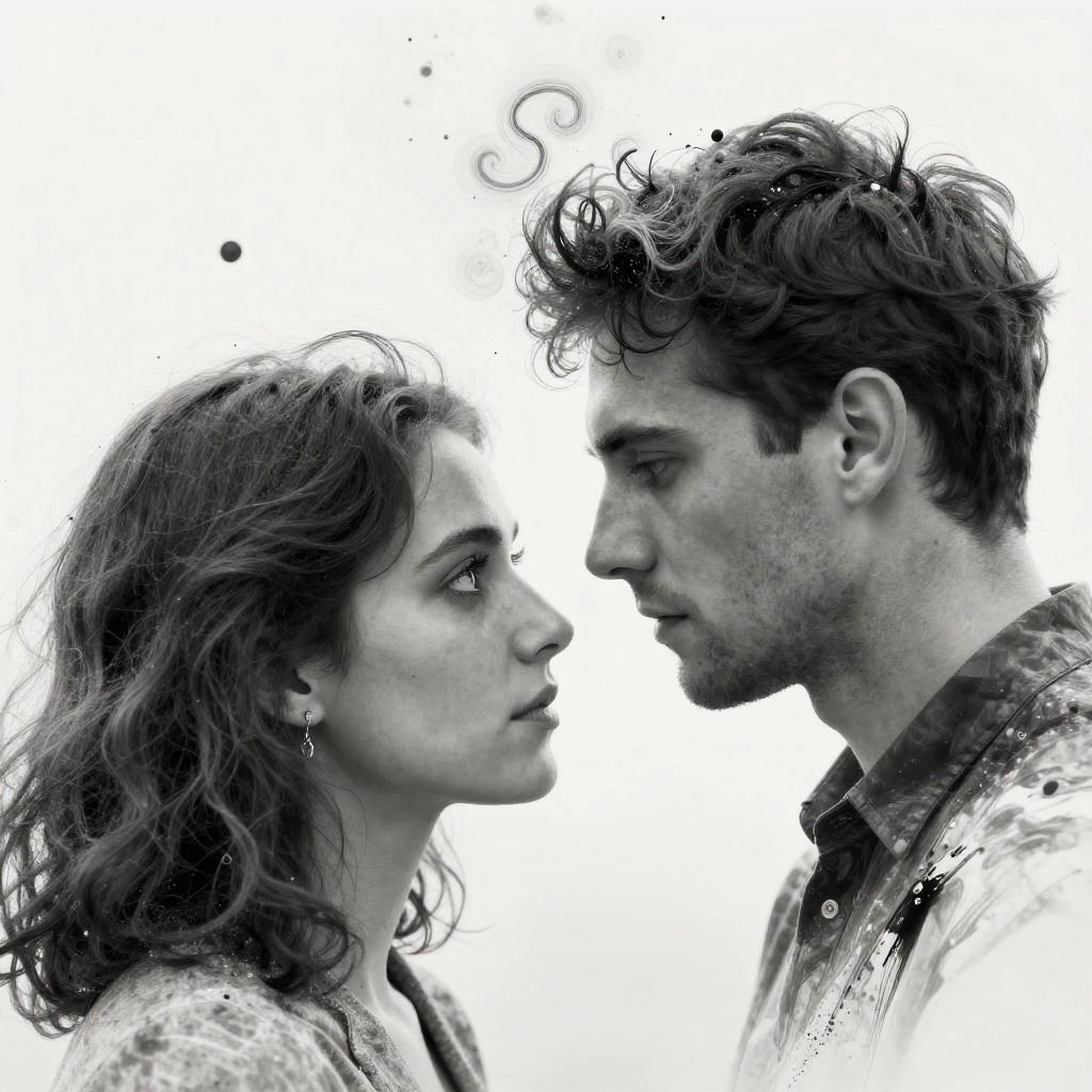 This black-and-white photograph depicts a close-up, side-facing profile of a young couple with intense, focused expressions. The woman, on the left, has wavy, shoulder-length hair and wears a light, textured jacket. She has delicate earrings and a slightly pointed nose. The man, on the right, has short, slightly tousled hair and a light stubble. He wears a buttoned shirt with a dark collar. Their faces are almost touching, creating a sense of intimacy and connection. The background is a stark white with splattered black ink-like marks, adding a dramatic, artistic flair. The image is high-contrast, emphasizing the emotional intensity of the moment.