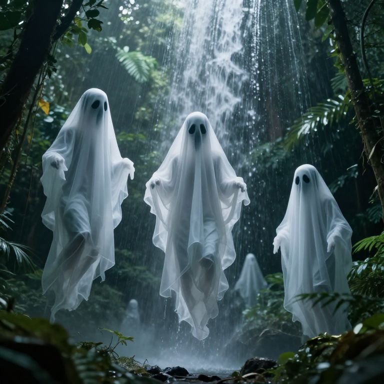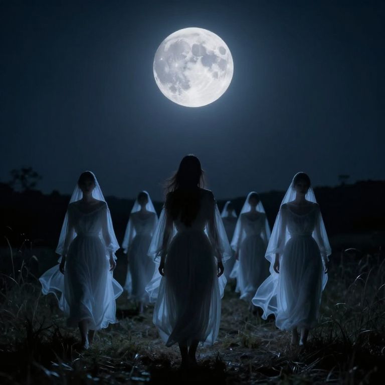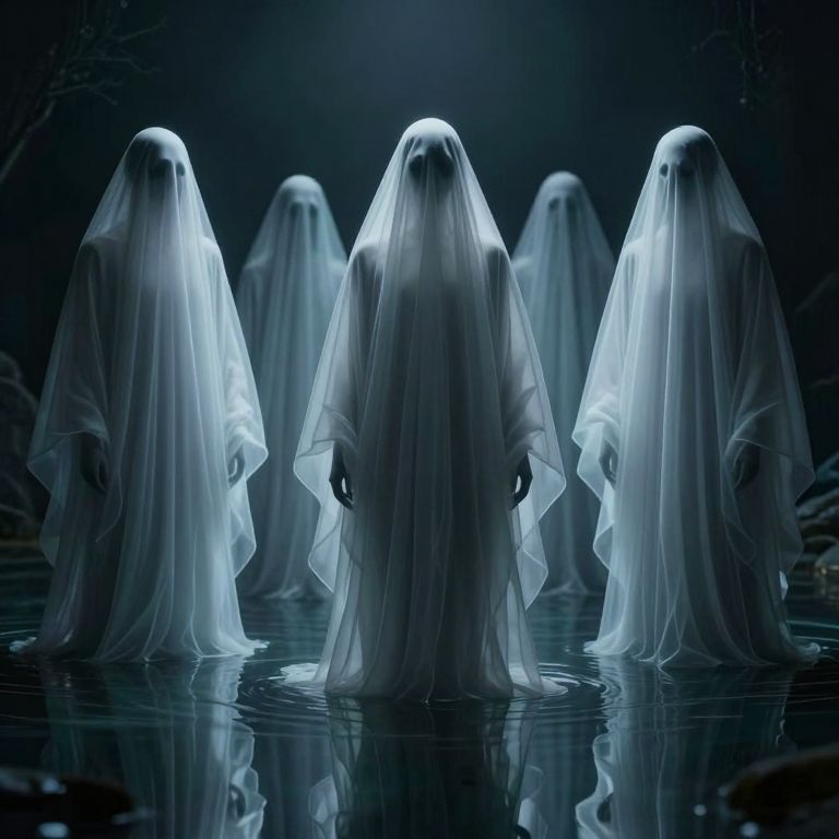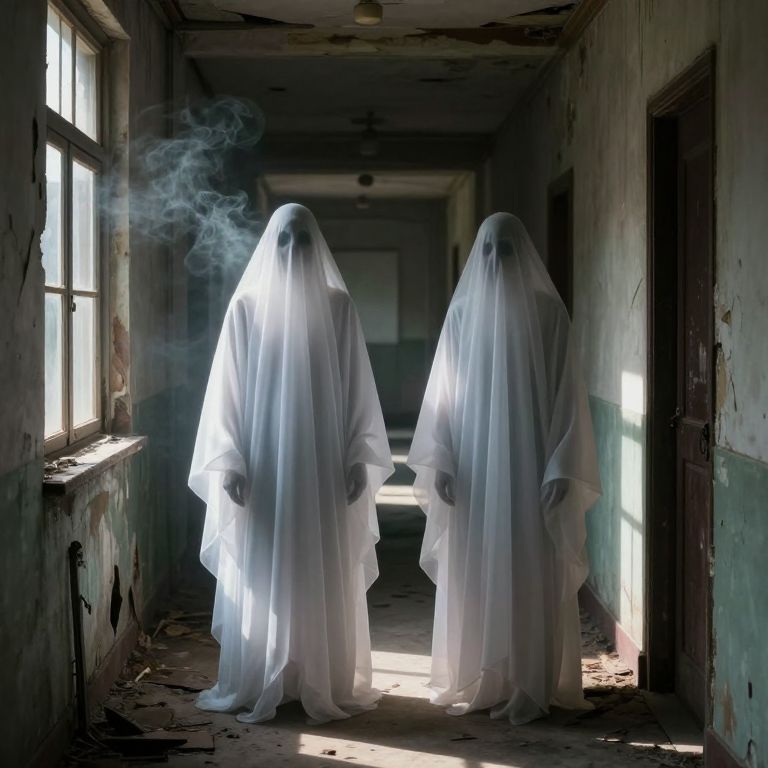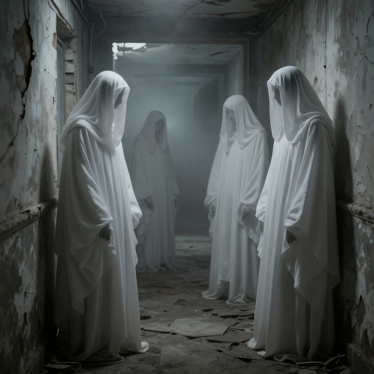 In an abandoned corridor shrouded in decay, ethereal figures draped in flowing white veils stand as silent sentinels, their ghostly forms defying gravity as they hover near windows and doors, leaving behind faint trails of mist that weave through the crumbling walls.