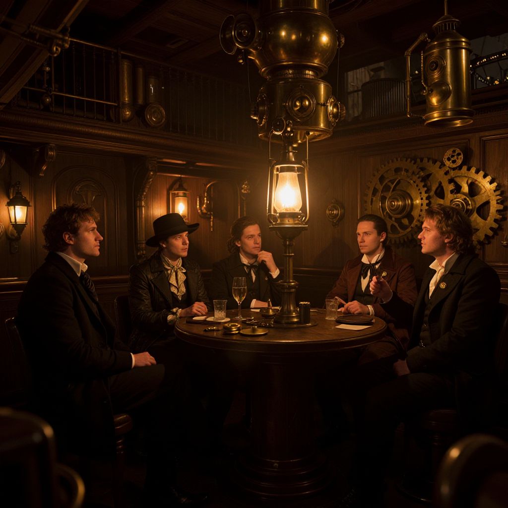 Photograph of five men seated around a dark wooden table in a dimly lit, steampunk-inspired bar. The men, dressed in dark, formal attire with one wearing a bowler hat, are engaged in conversation. Warm, amber lanterns hang from the ceiling, casting a soft glow. The background features intricate wooden paneling and brass gears, adding to the steampunk aesthetic. Each man has a glass and a plate with food, and the table is cluttered with drinking glasses and a bottle. The overall mood is intimate and vintage, with rich, dark tones dominating the scene.
