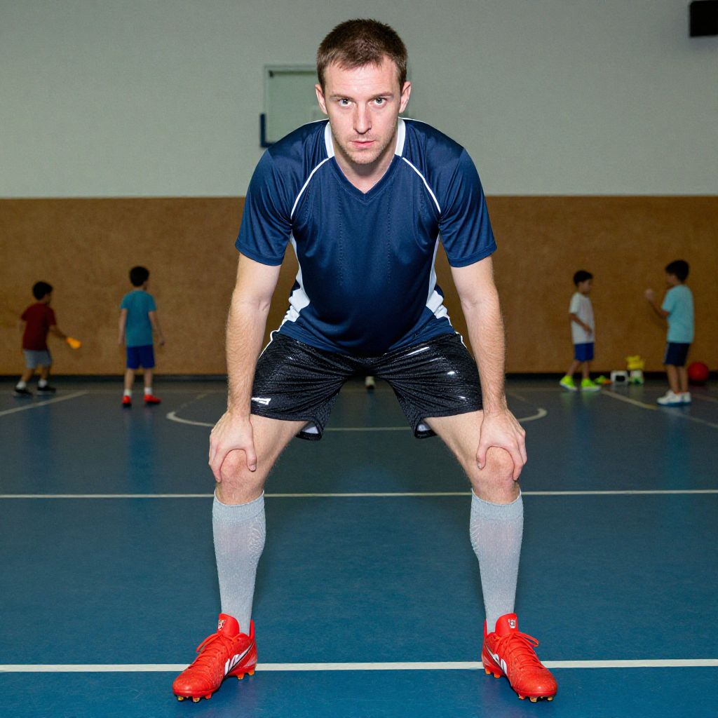 A man, lightweight moisture-wicking jersey, navy blue with white accents, breathable mesh shorts, black with reflective details, high-performance lacrosse cleats, vibrant red, compression socks, gray with subtle patterns, community center gym, children playing with toys, Ilford film stock, focused expression. Man has masculine face and piercing eyes