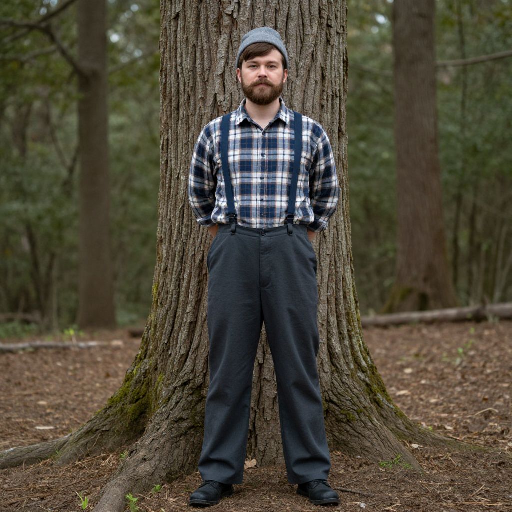 Into woods baker costume, 1boy, male focus, solo, facial hair, shirt, outdoors, hat, mustache, beard, full body, looking at viewer, standing, realistic, arms behind back, shoes, tree, plaid shirt, overalls, collared shirt, pants
