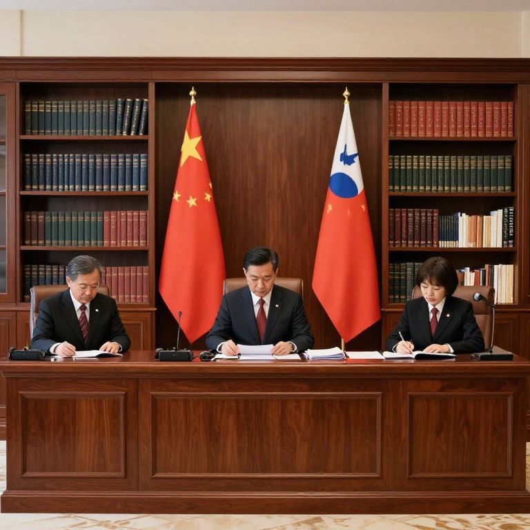Three men in black suits with ties, seated at a wooden desk, writing in notebooks, flanked by Chinese and Korean flags, in front of book