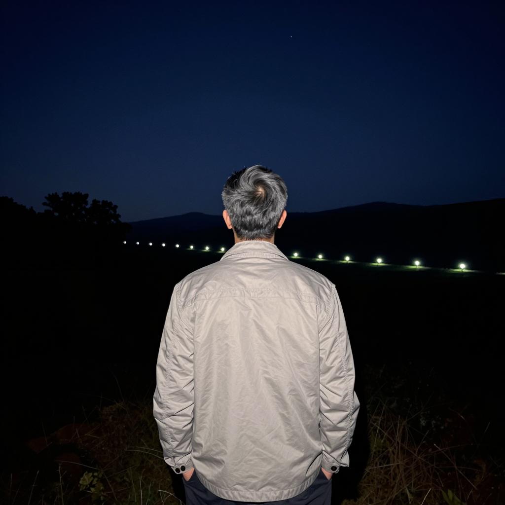 Man in gray shirt and blue pants stands on metal bridge, facing away. Blue laser beams cross background, bright lights illuminate. Steel beams and pipes surround. Nighttime setting. Man wears black shoes, arms slightly raised. Two bright lights in background.