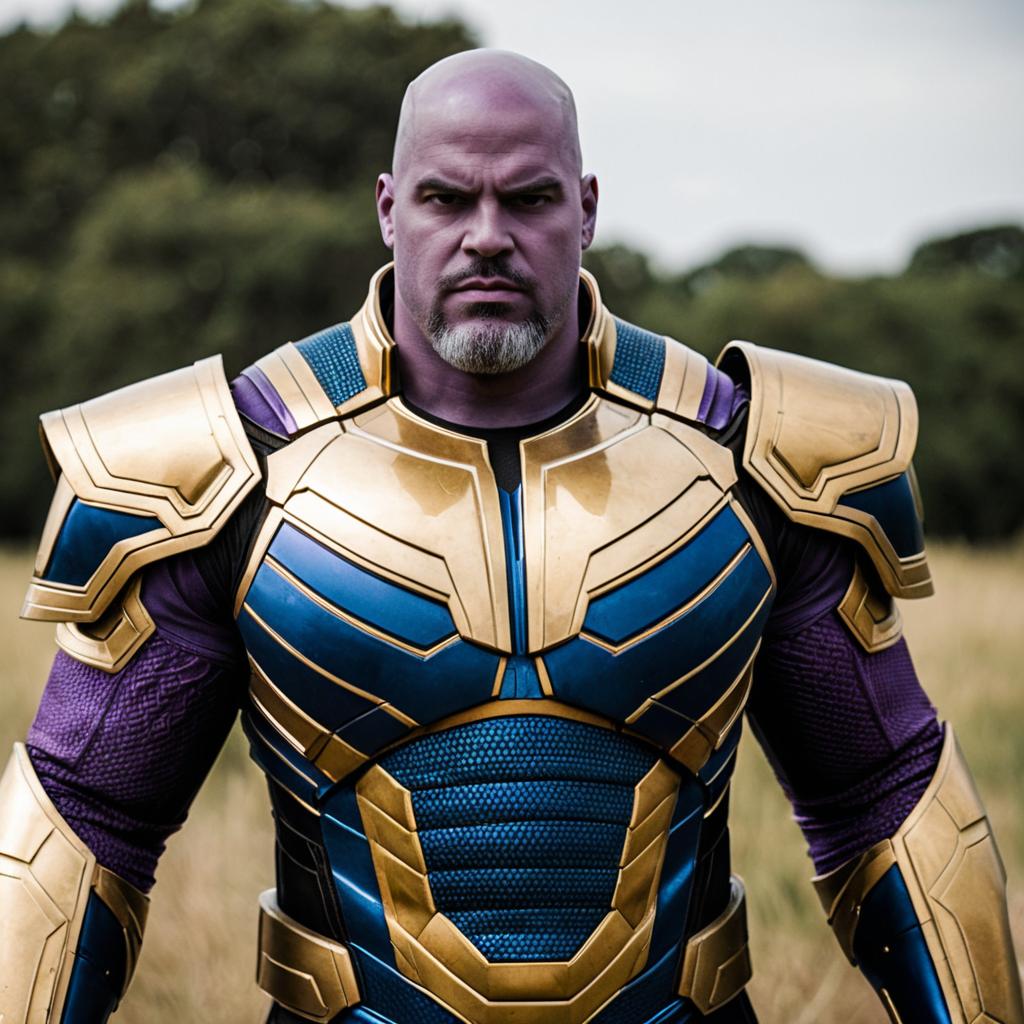 Portrait of a plus size man wearing a detailed Thanos-inspired costume featuring gold and blue armor with shoulder pads. The man is bald, has a goatee, and is looking directly at the camera. The background is an outdoor grassy area with blurred trees.