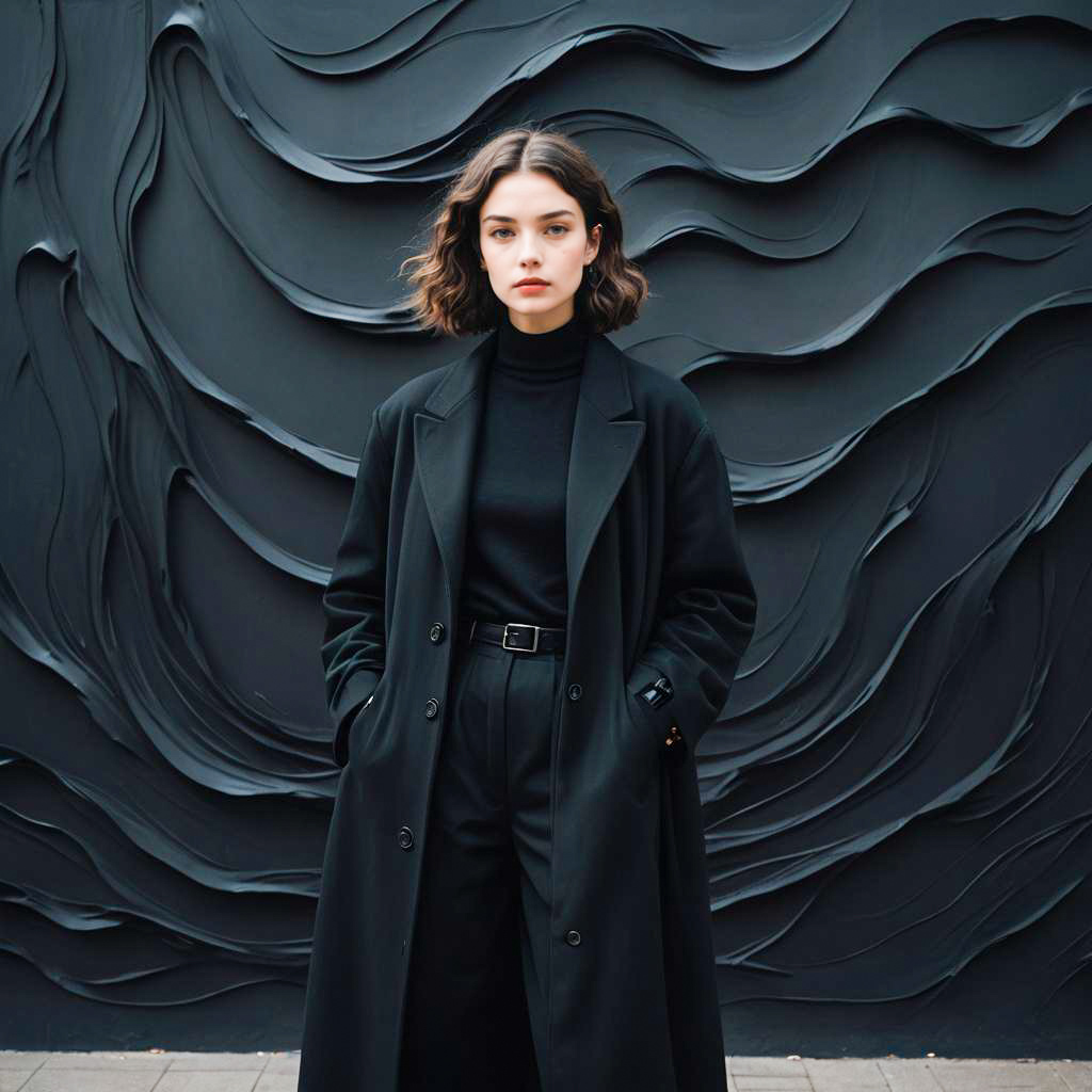 Portrait of a young petite woman with wavy brown hair wearing a black long coat, black sweater, and black wide-leg trousers. She stands confidently with hands in pockets in front of a dark, surreal, wave-like textured wall background, creating an artistic and modern look.