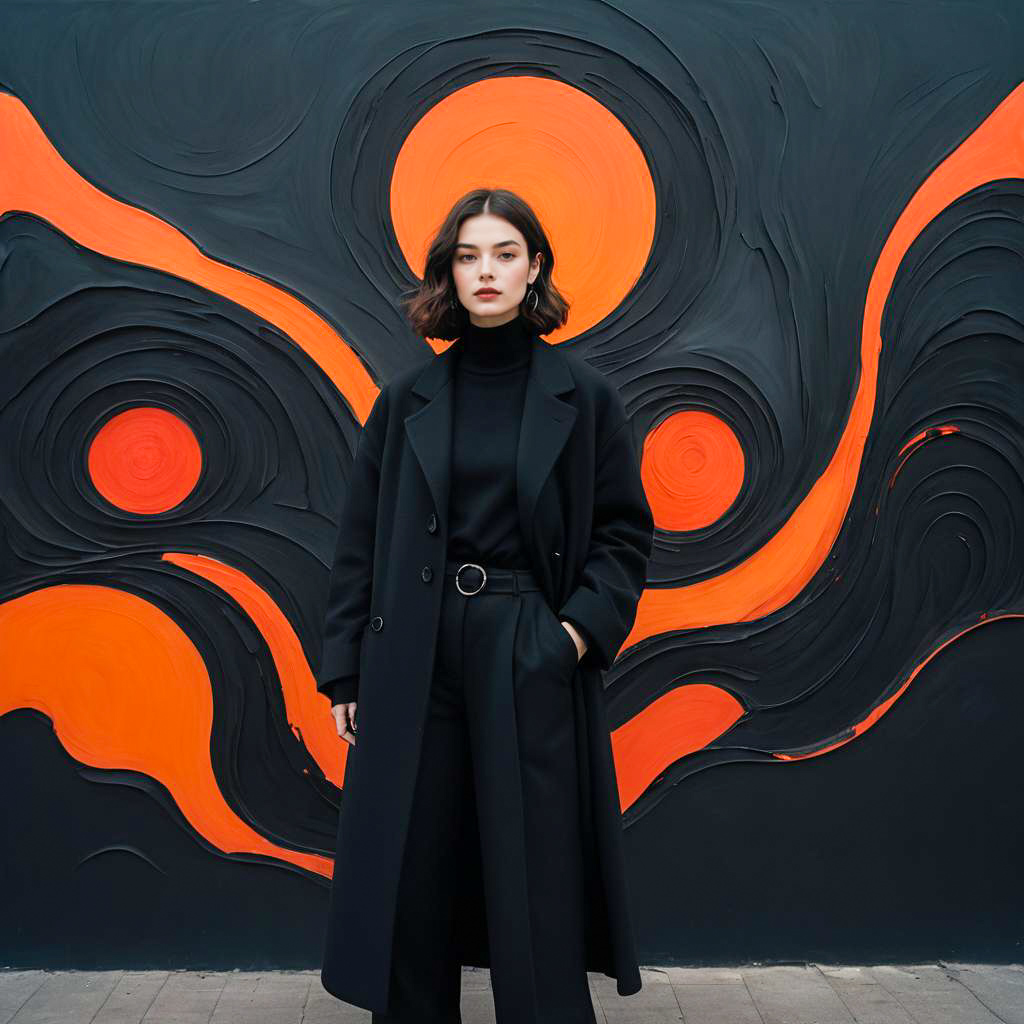 Young woman, Petite, Wavy, all black outfit men, black long coat with black sweater and black wide-leg trousers, artistic expressionist colors, surreal backdrop