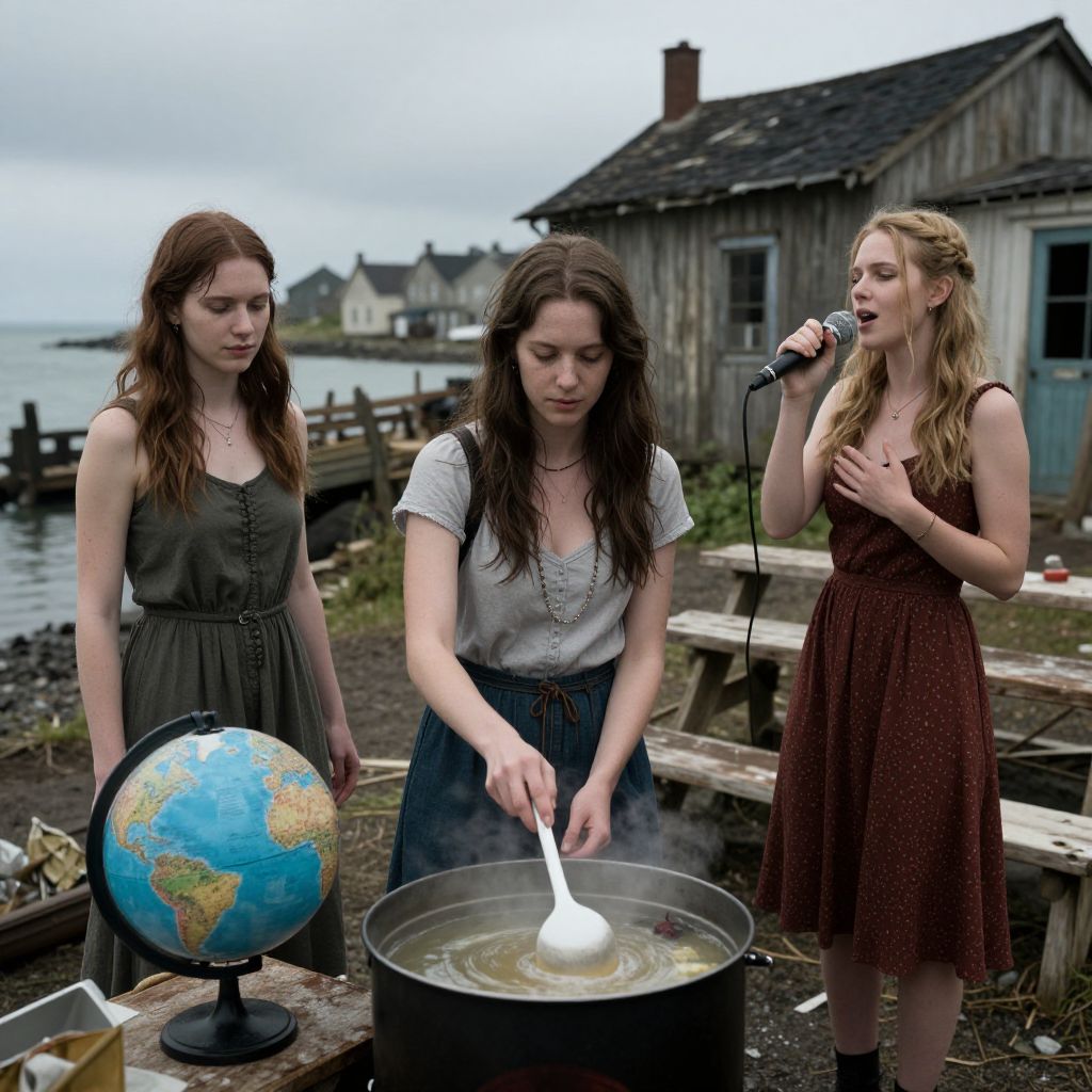 Photograph of three young women outdoors by a coastal, rustic setting with old, weathered wooden houses in the background. The woman on the left has long brown hair, wears a dark gray dress, and stands beside a globe. The central woman with wavy brown hair, wearing a white blouse and blue skirt, stirs a large pot with a white spoon. The right woman, with long blonde hair, sings into a microphone, dressed in a brown, sleeveless dress. The scene is overcast, with a wooden dock and pebbled shore in the background. The women appear focused and engaged.
