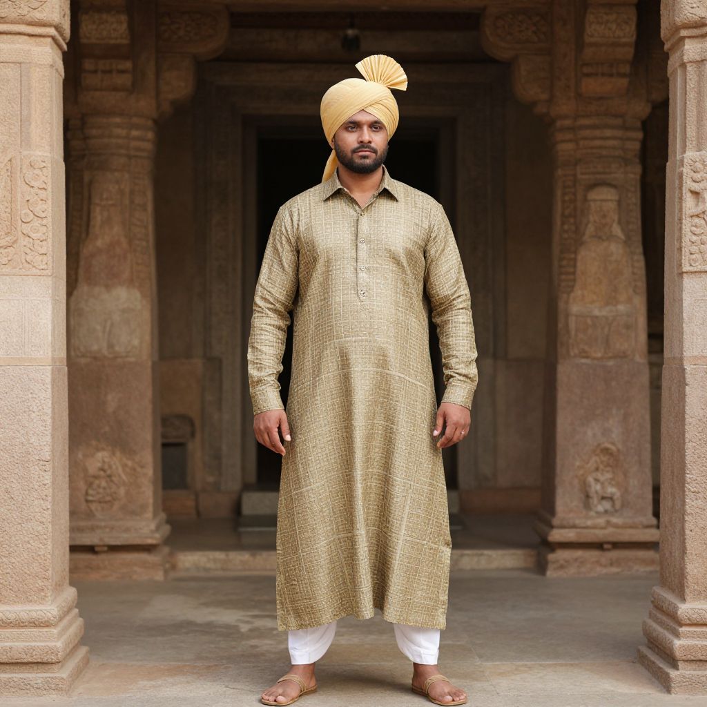 Indian Terrain Shirt Costume, man in a turban standing in a temple