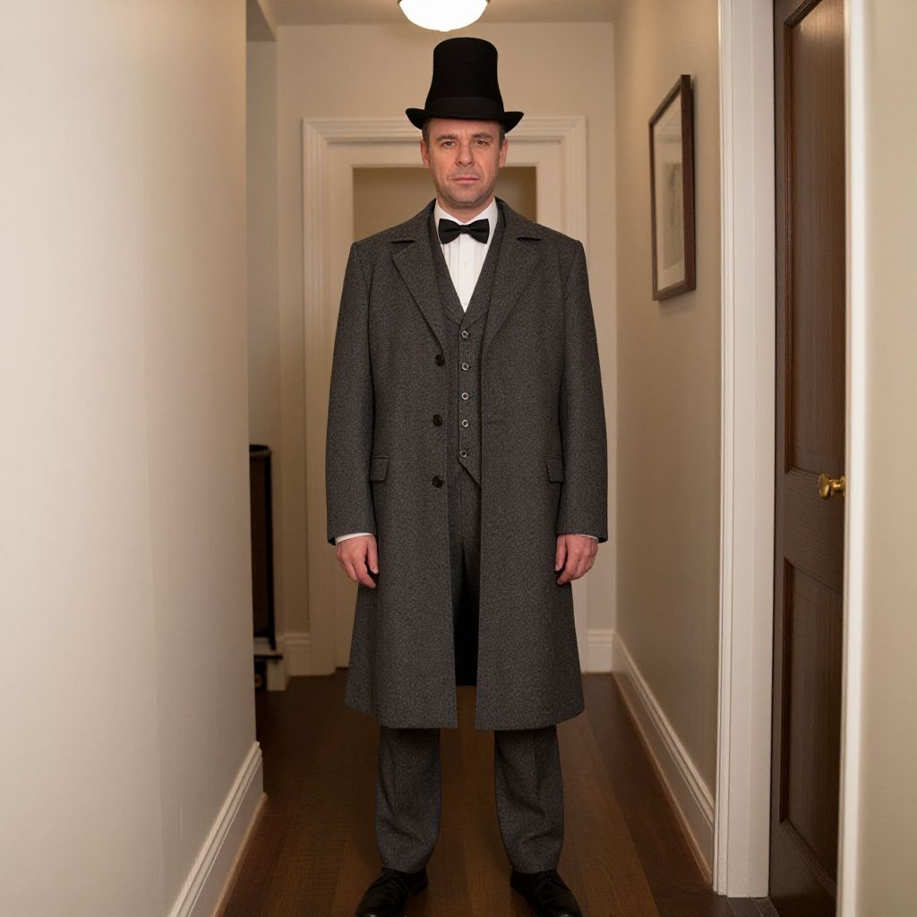 Photograph of a Caucasian man standing in a narrow, dimly lit hallway with white walls and wooden floors. He is dressed in a Victorian-style ensemble, featuring a black top hat, black bow tie, white dress shirt, and a long, dark gray wool overcoat that reaches his knees. He has short, light brown hair and a clean-shaven face. His expression is neutral. The hallway has a closed door to the right and a framed picture on the left wall. The lighting comes from a ceiling fixture, casting a warm glow.