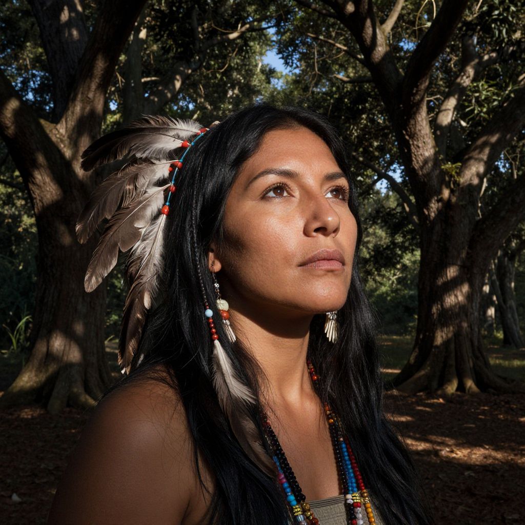 Imagine an ultrarealistic portrait inspired by Caravaggio's chiaroscuro style, featuring a Native American Southern European woman with long black hair adorned by feathers and beads. Captured at dawn, sunlight filters through ancient tree canopies, casting elongated shadows that highlight her unique features. The perspective is unconventional, as if viewed from above the subject's shoulder, conveying both strength and serenity. This interplay of light and shadow draws viewers into an emotional spectrum ranging from reverence to introspection.