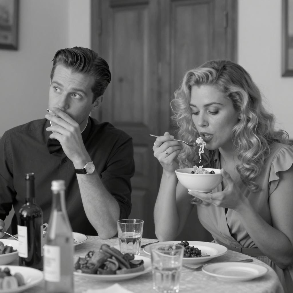 A photograph of a man and woman in a restaurant. The man, with dark slicked-back hair and a gray suit, holds a lit cigarette close to the woman's mouth. The woman, with dark brown hair in an updo, wears pearl earrings and a black top. Background includes a detailed mural. Man's face is focused, woman looks slightly to the side.