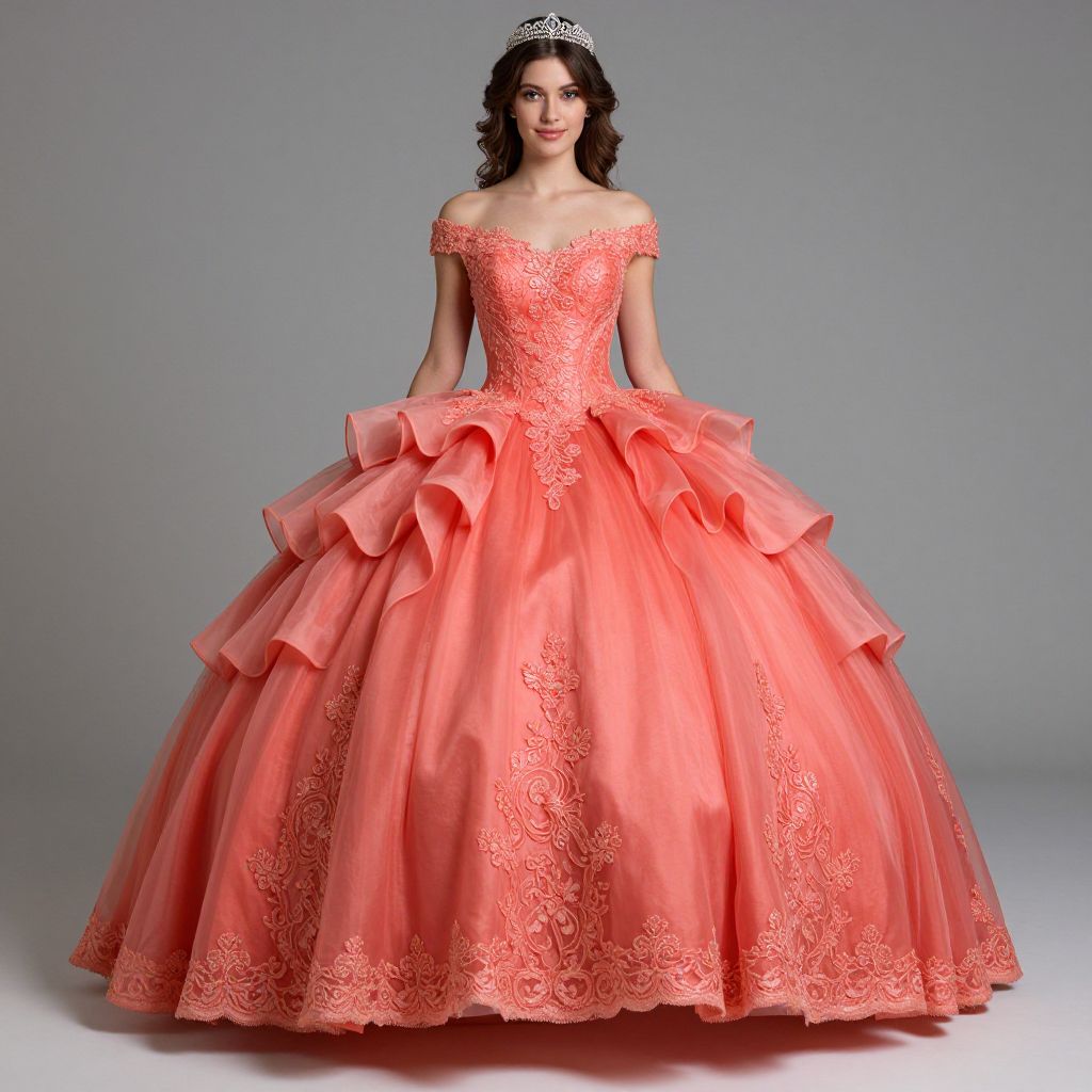 A woman elegantly showcases a 2019 coral lace and organza two-piece quinceaƱera dress featuring a modest, ruffled ball gown design with sheer prom detailing, embodying a classic and timeless style with high-definition clarity.