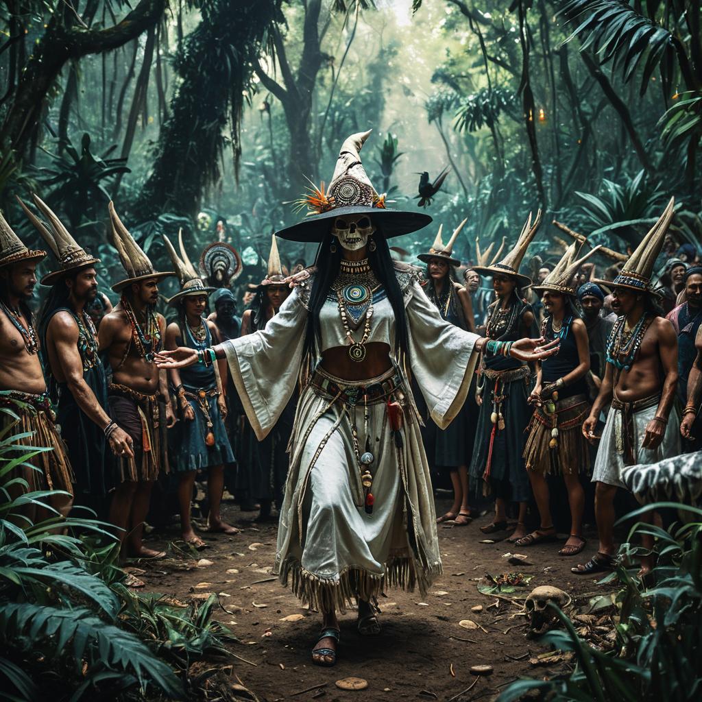 Digital fantasy art depicting a mermaid adorned in a lace and leather cloak dancing gracefully in a moonlit swamp. She is surrounded by a crowd of shadowy familiar figures under a full moon, with barren trees and glowing lanterns enhancing the mystical atmosphere. The scene conveys a dark, enchanting nighttime ritual in a magical forest swamp setting.