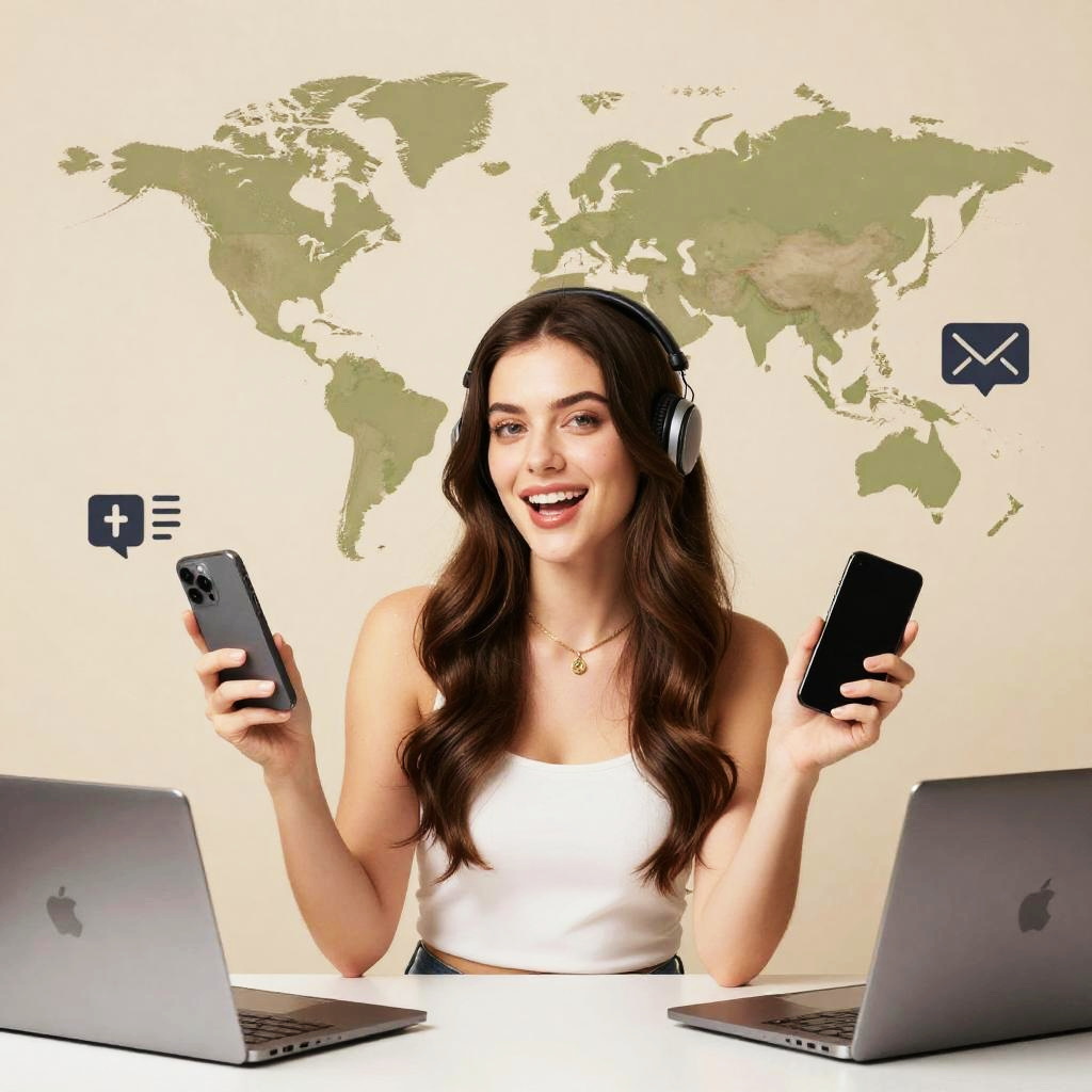 A surreal scene portraying a female influencer surrounded by symbols of global community and social media, blending realistic and fantasy elements, emphasizing themes of identity and diversity.