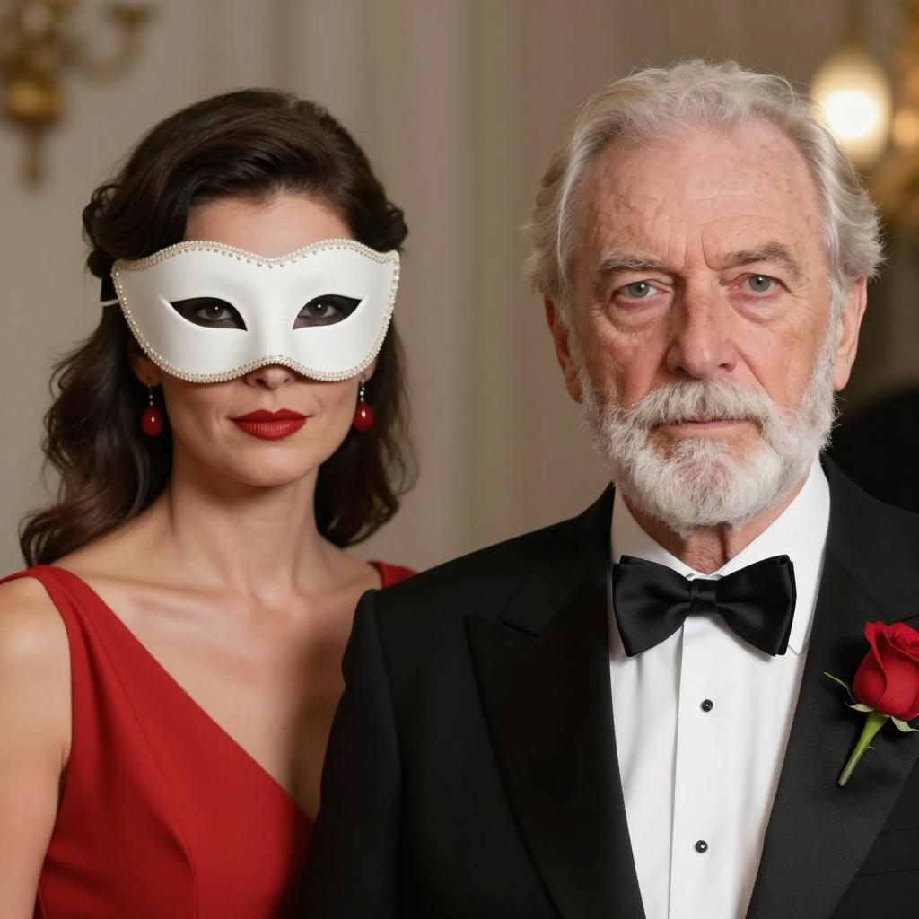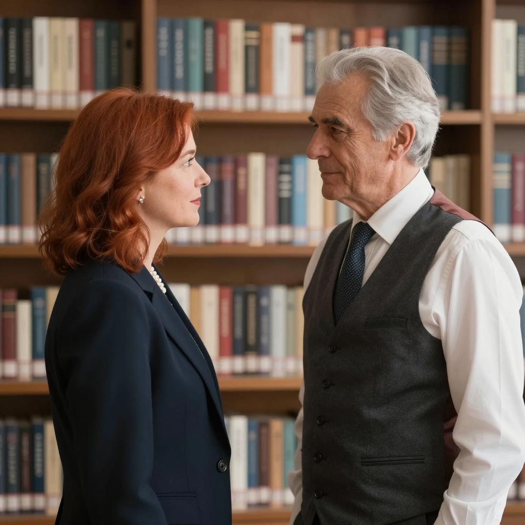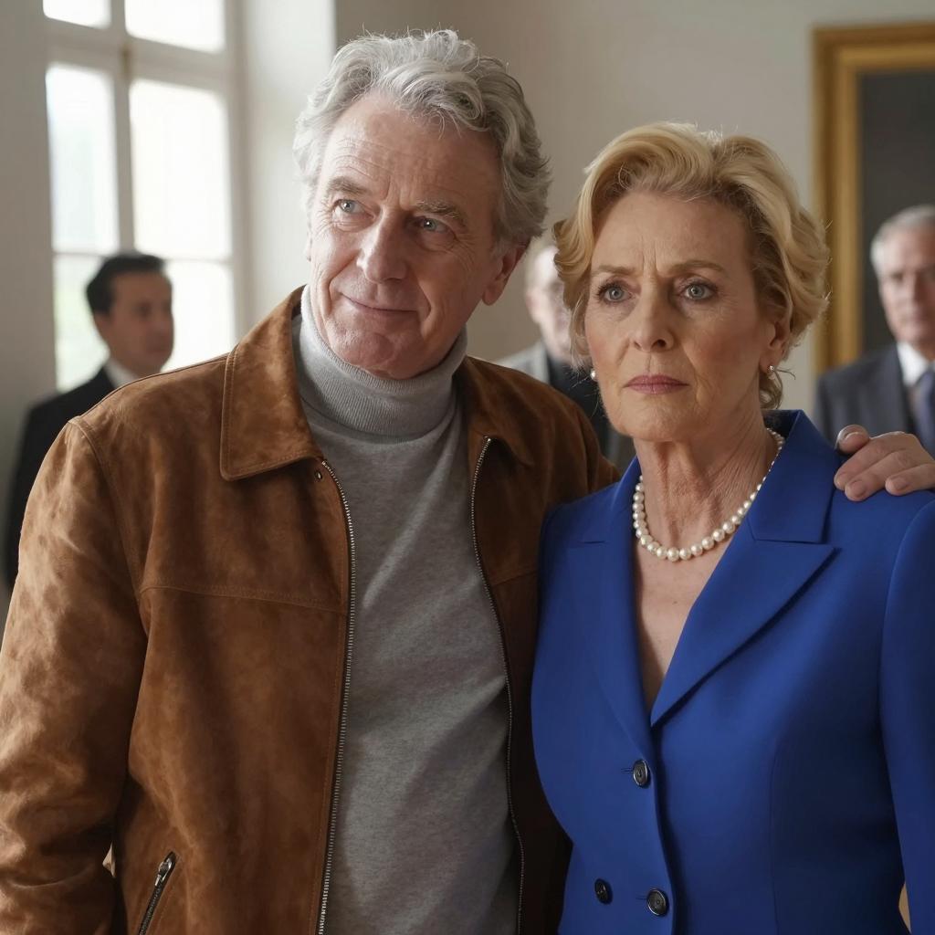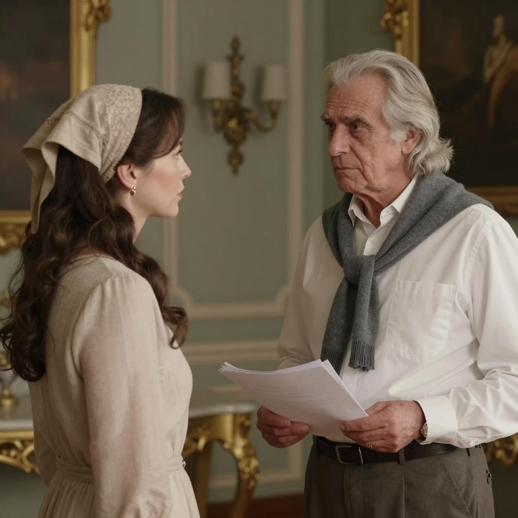 Photograph of an older man and woman in a dimly lit, ornate room. The man with long gray hair, white shirt, and gray scarf holds a stack of papers, looking at the woman. The woman with long dark hair in a headscarf, wearing a beige dress, faces him. Both have serious expressions. Background includes gold-trimmed furniture and soft lighting.