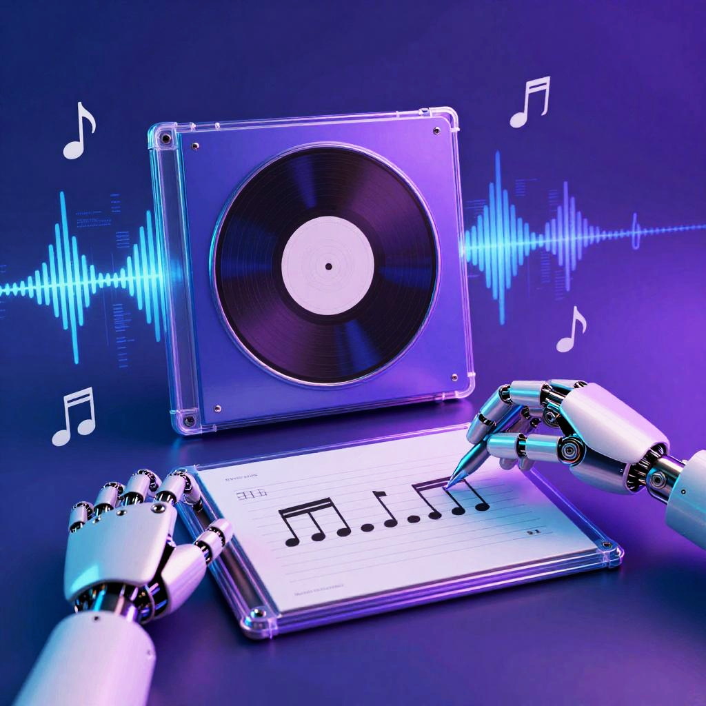 Creative AI album generator scene, robotic hands assembling music tracks into an album, surrounded by floating sound waves and digital notes, vibrant mix of blue and purple tones with a modern tech background