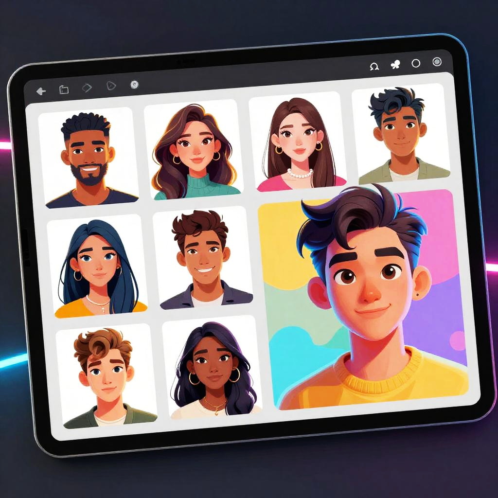 Character portrait creator tool interface, digital art style, vibrant colors, futuristic UI elements, multiple character sketches in progress on screen, diverse facial features, detailed close-up of a character's face, sleek modern design, artistic creativity vibe