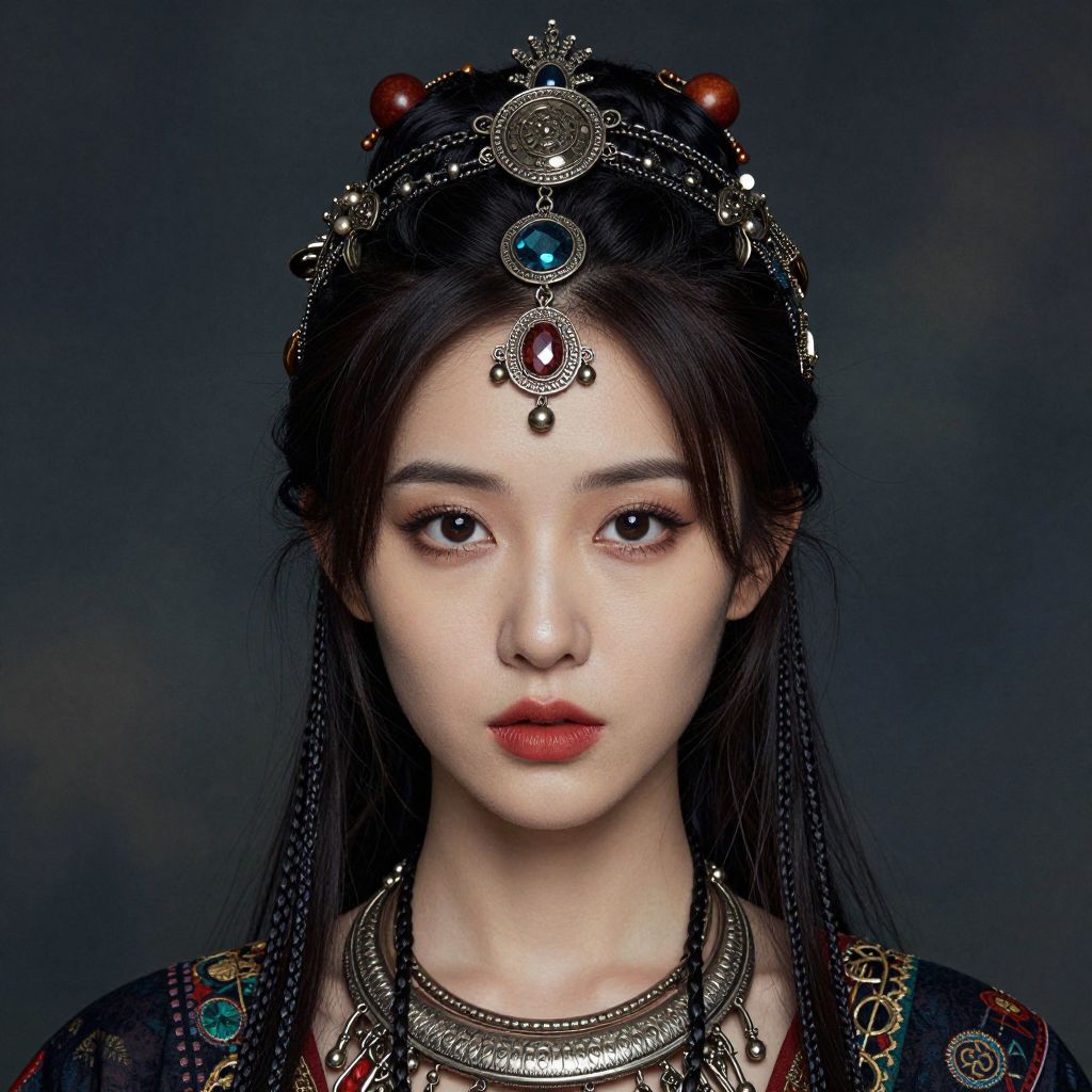 Photograph of an East Asian woman with pale skin and black hair, styled in a traditional updo adorned with a metallic headdress featuring red and blue gemstones. She wears intricate silver jewelry, including a large, central blue gemstone forehead piece, and multiple necklaces with detailed designs. Her makeup is subtle, with red lipstick. The dark, blurred background contrasts with her illuminated face. The image has a high-contrast, almost surreal quality, emphasizing the ornate details of her attire and jewelry. The overall style is reminiscent of traditional Asian royal portraiture.