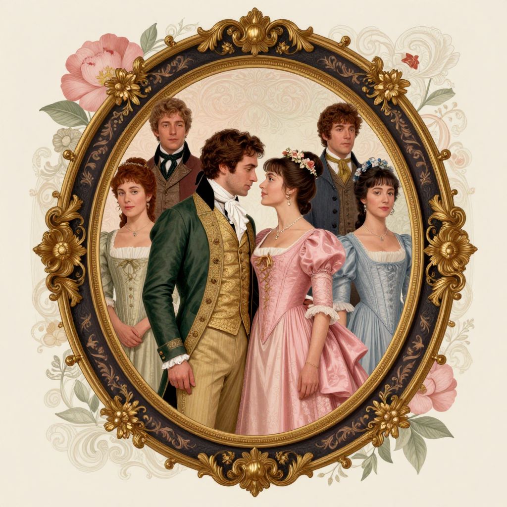 This digital illustration features a classical, Victorian-style portrait of four young people, framed by an ornate, gold-bordered oval mirror with pink and white floral accents. The central couple, a man in a green jacket with gold trim and a woman in a pink, puffed-sleeve gown, stand close, gazing at each other. To their left, a woman in a white dress with lace trim stands next to a man in a dark suit with a yellow tie. The background is a subtle, cream-colored floral pattern. The characters have fair skin, curly brown hair, and elegant, refined features, embodying a romantic, historical ambiance.