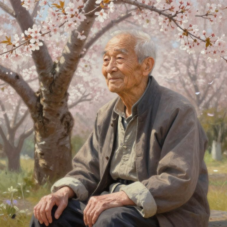 Seventy years old wise elder sitting peacefully under a blossoming cherry tree, serene expression, detailed wrinkles, soft warm sunlight filtering through leaves, traditional clothing, oil painting style, highly detailed and realistic