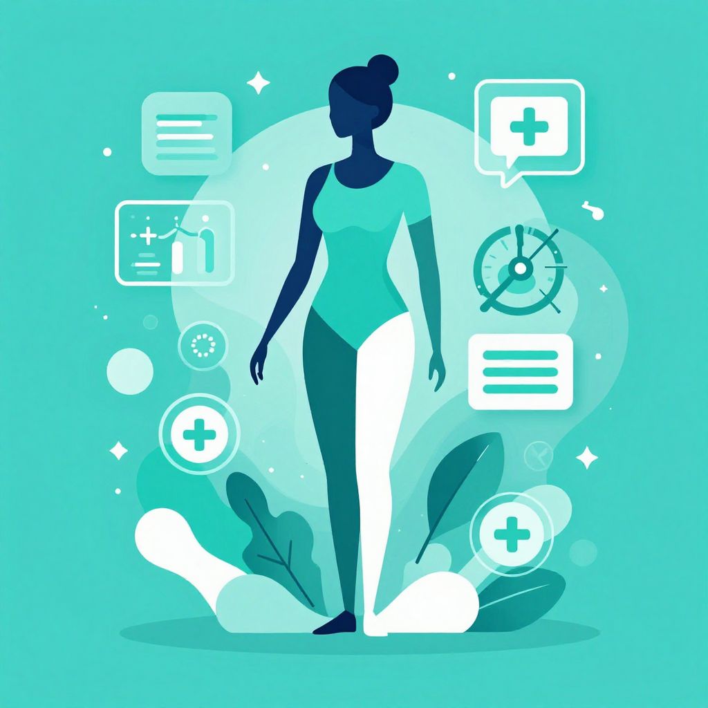 Stylized illustration of a slim maker concept, showing a slender figure morphing through advanced technology, abstract shapes and smooth lines in vibrant colors like teal and white, digital health monitoring symbols floating around, modern wellness theme