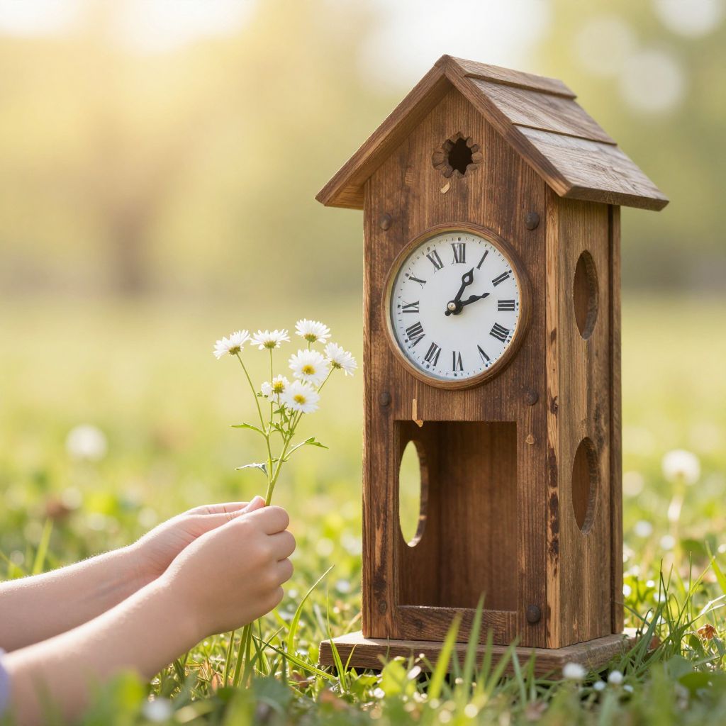A vibrant, digital photograph of a large, circular clock adorned with colorful flowers, standing in a lush meadow. The clock face is white with black Roman numerals and black hands, encircled by a wreath of yellow, red, pink, and blue flowers. A spiral staircase, also decorated with flowers, winds around the clock's base. The meadow is filled with a variety of wildflowers, including white, yellow, and purple blooms, under a bright blue sky with fluffy white clouds. A solitary tree is visible in the distant background.