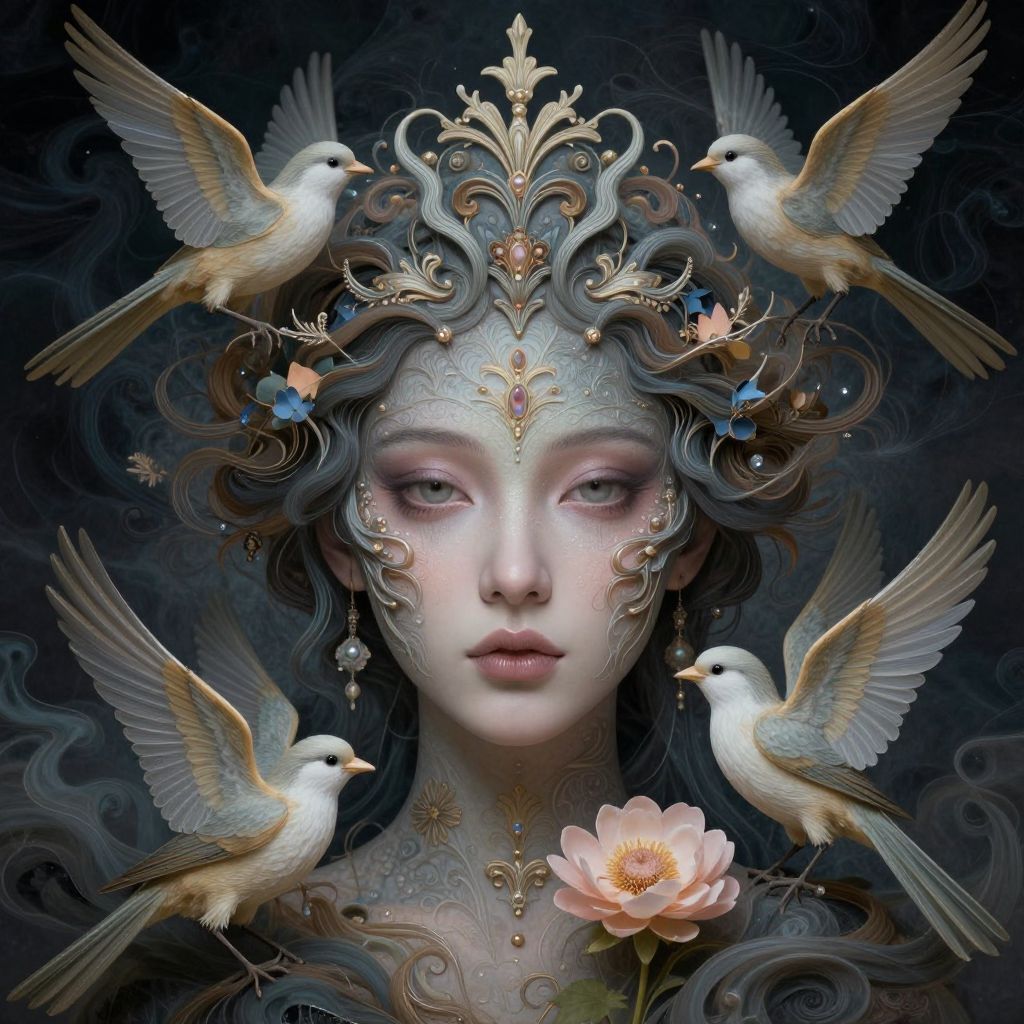 A surreal, intricately detailed portrait with ethereal elements, featuring a woman's face adorned with a complex, ornate design, surrounded by birds and a flower, set against a dark, dreamlike background.