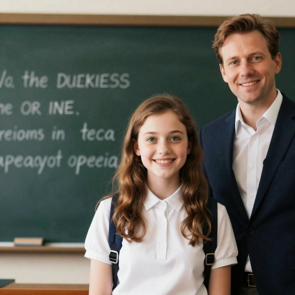 Photograph of a smiling adult man and young girl in school uniforms, standing in front of a chalkboard with partially visible text.