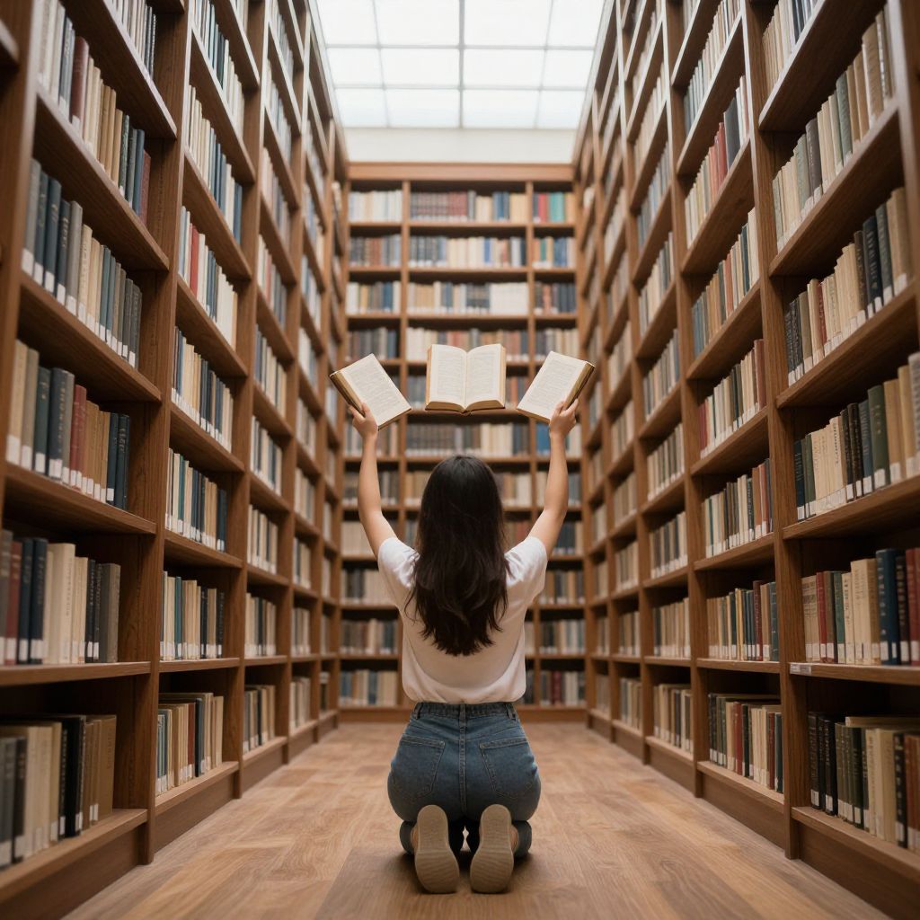 Photograph of a woman with long dark hair, kneeling on a wooden floor in a library aisle, facing away. She wears a white long-sleeve shirt and high-waisted blue jeans. She holds an open book in each hand, arms raised. Tall wooden bookshelves filled with books line both sides of the aisle, receding into a bright, skylit background. The perspective creates a vanishing point effect, emphasizing the depth of the library. The woman's beige sneakers are visible on the floor. The overall atmosphere is serene and studious.