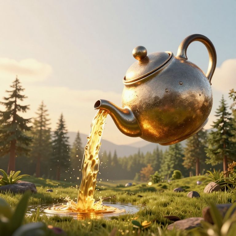 A surreal 3D-rendered scene depicts an enormous, floating teapot crafted from metallic textures, pouring a radiant golden stream into a tranquil forest landscape during the golden hour, blending fantasy with natural beauty in a high-definition, dreamlike visual effect.