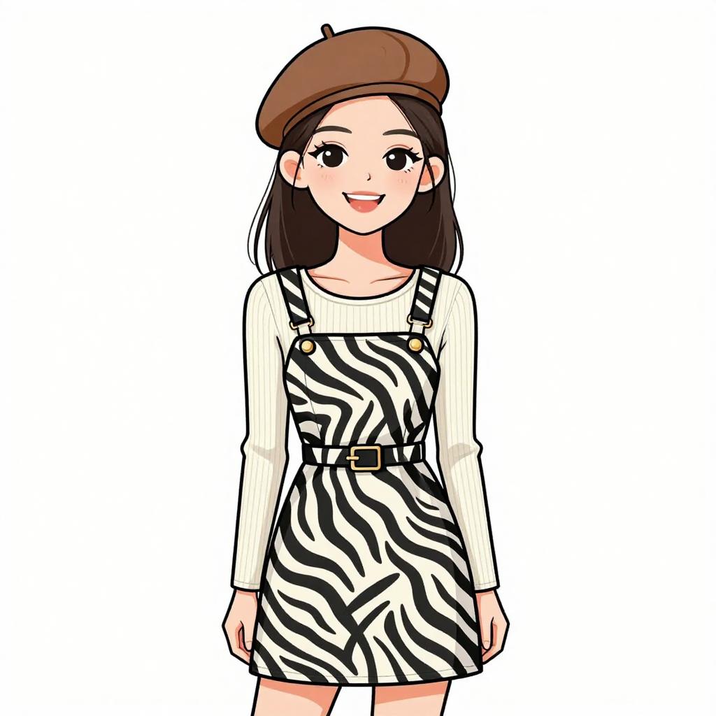 Woman with pretty face and pretty hair. smiling Woman, casual chic, zebra print mini pinafore dress in black and white, sleeveless, square neckline, layered over a ribbed long sleeve white top, brown beret, light makeup, joyous expression, plain white background. --sref 1467