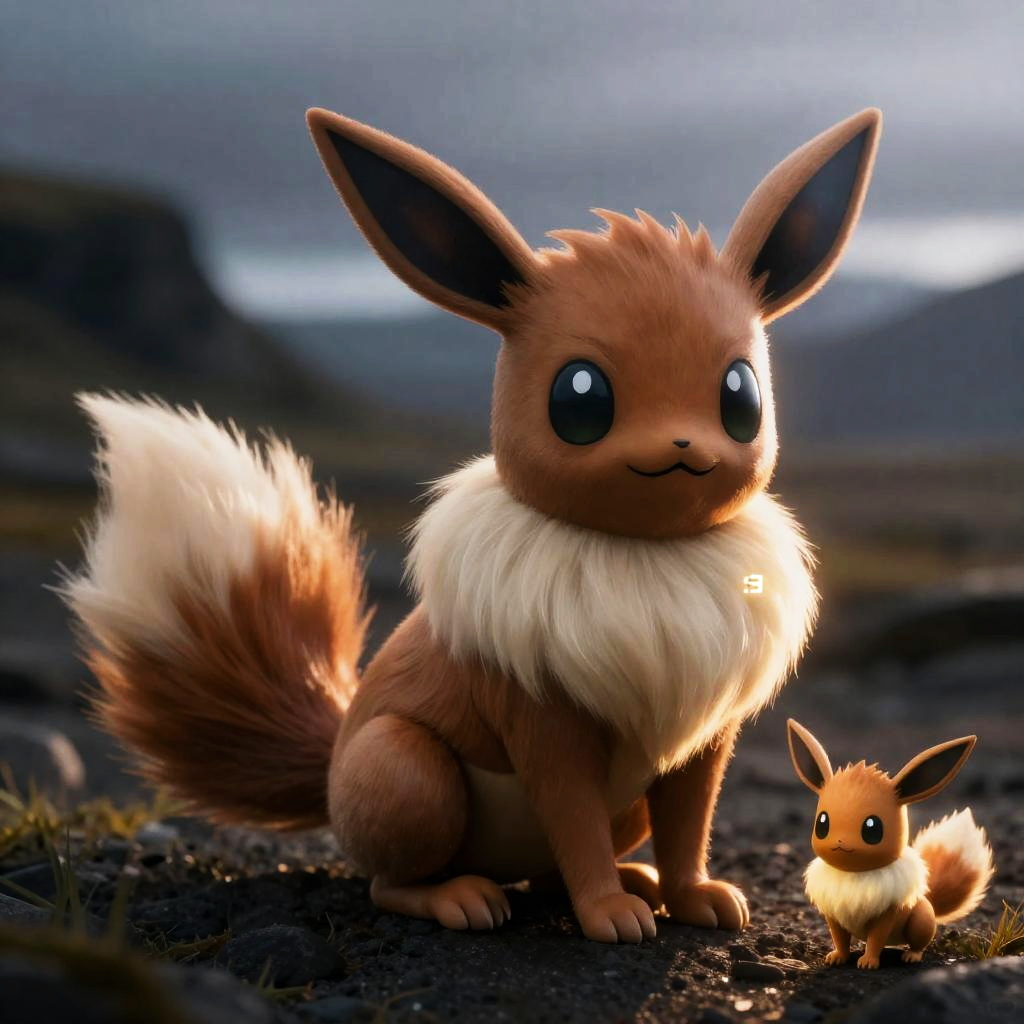 Uploaded on e621, by Takahirosi, by Floris van Dyck, by Pino Daeni, by Ilya Ostroukhov, by Edmond Bille, solo (((feral))) ((brown fluffy Eevee)) with (((brown body))) and (((white neck tuft))) and (brown fluffy dipstick tail) and ((clear green eyes)), (detailed Daniel F. Gerhartz feral Eevee), (detailed Bonifasko lighting), (detailed fur), (detailed skin)((sitting at iceland on evening)), (cinematic lighting), ((detailed background)), (((front view))), (((:3))), (((glowing))), (half body shadow), (chibi), [backlighting], [crepuscular ray], [detailed ambient light], [gray natural lighting], [ambient light on the belly], (higher wildlife feral detail), [realistic proportions], [sharp focus], (shaded)
