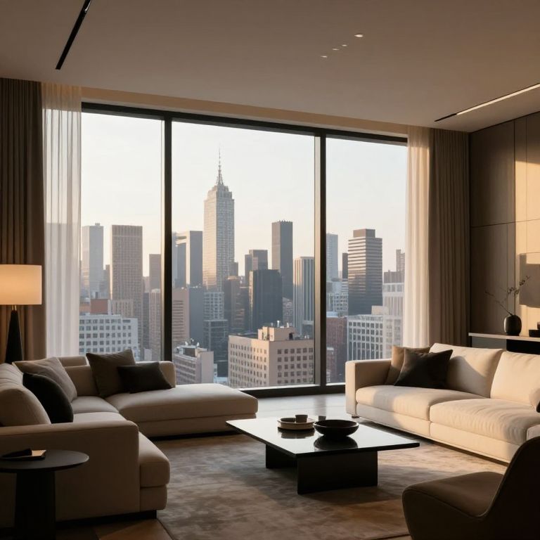A sleek, modern living room in one of Manhattan's most luxurious penthouses features a minimalist design with high-definition details, showcasing a panoramic view of the city skyline through floor-to-ceiling windows, complemented by warm golden-hour lighting and contemporary furnishings.