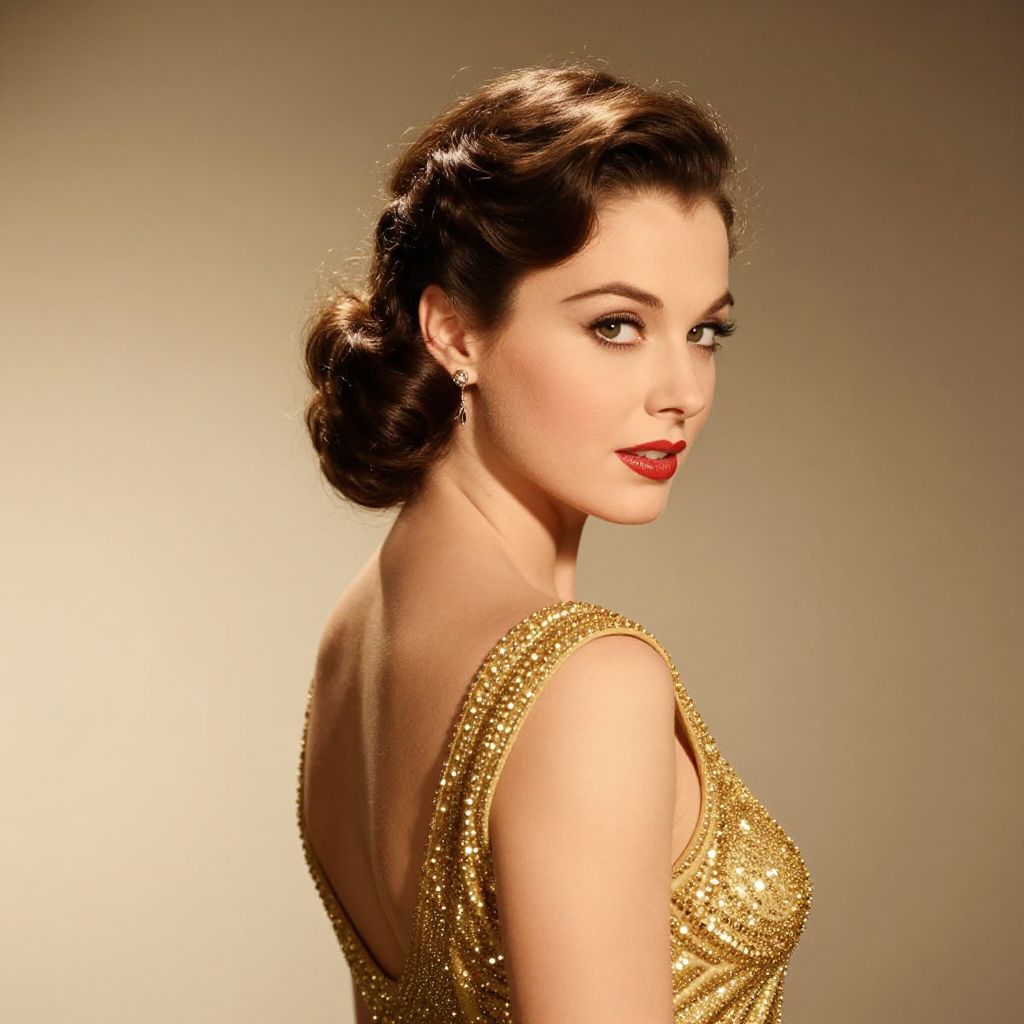 A glamorous woman showcases a stunning hairstyle and sparkling gold dress, evoking a sense of classic elegance and sophistication. The intricate details of her attire and the luxurious style highlight her beauty and poise, reminiscent of vintage Hollywood icons.