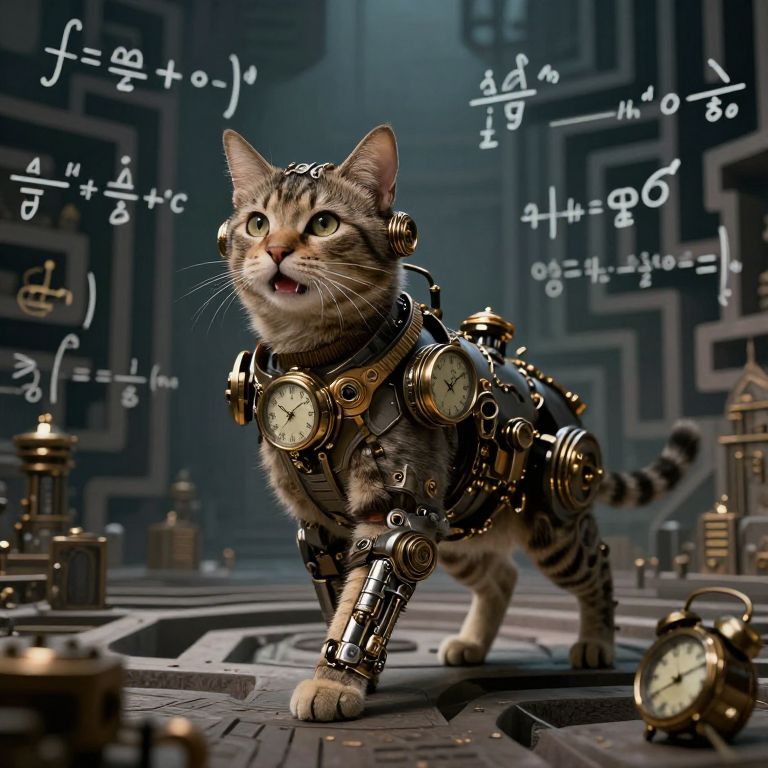 A steampunk feline guardian strides through a labyrinthine world of shifting equations, its mechanical purr resonating with the timeless dance between order and mystery.