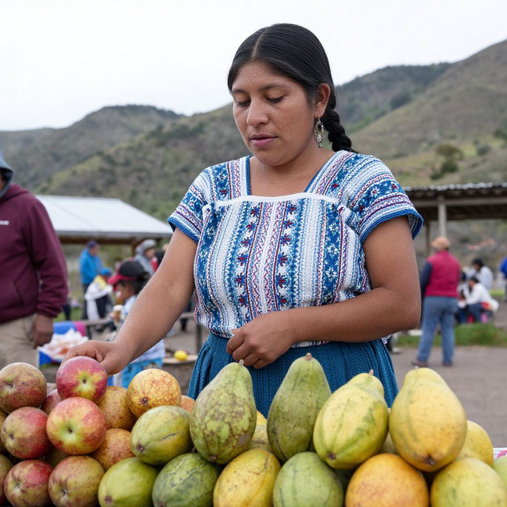 Photograph of a young Latina woman with dark hair in a ponytail, wearing a blue and white patterned blouse and blue skirt, standing at an outdoor market stall. She is arranging a pile of red, yellow, and green pears. Background shows blurred people, a mountainous landscape, and a white-roofed structure. Her expression is focused. She wears large, dangling earrings. The image has vibrant colors and a slightly over-saturated style, emphasizing the natural setting and the fresh produce. The texture of the blouse contrasts with the smooth, slightly fuzzy texture of the pears.