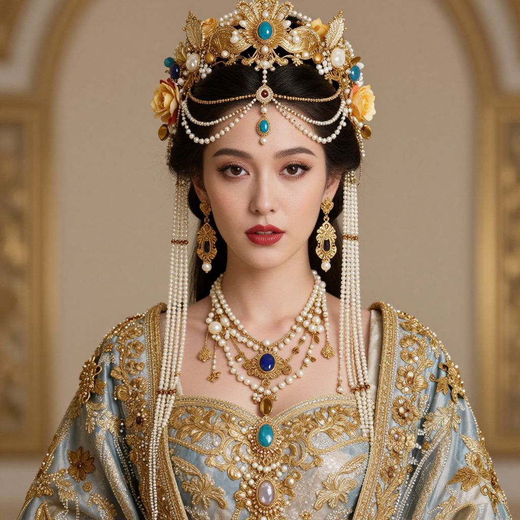 A woman in an opulent, ornate outfit adorned with intricate gold and pearl jewelry, floral headpiece, and elaborate dress, exuding a regal and fantastical fashion aesthetic.