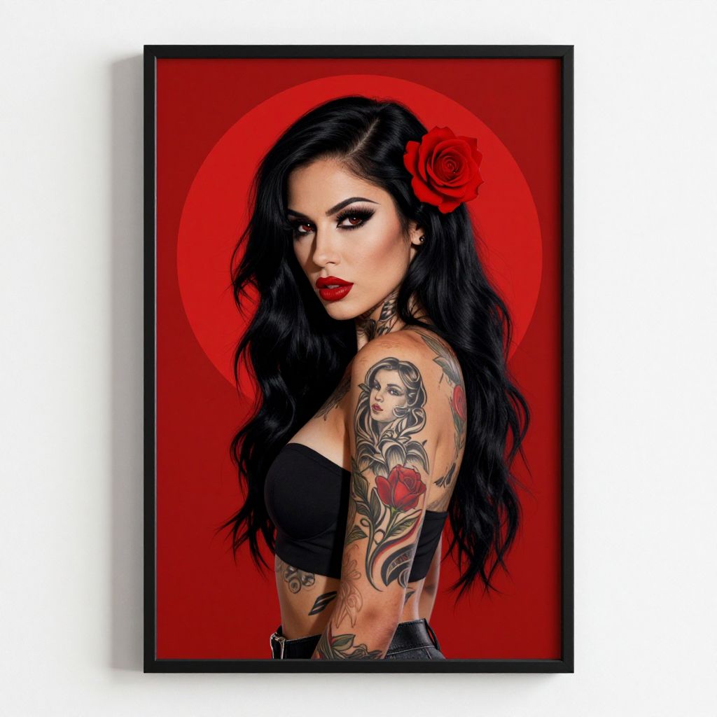 A striking digital art print featuring a bold, tattooed woman with long black hair adorned with a red rose, set against a vibrant red circular background, showcasing a high-definition, retro-inspired aesthetic by JulieFilipenko.