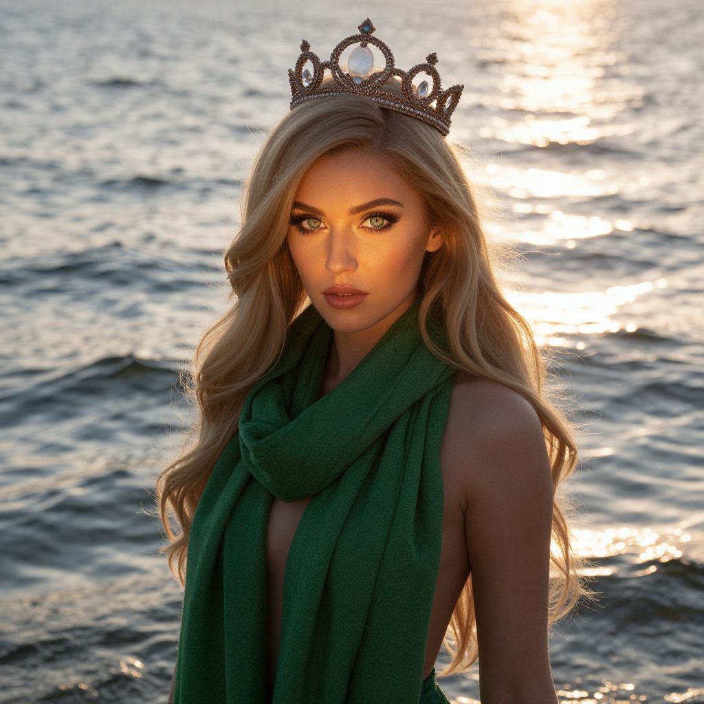 A woman with long blonde hair wearing a crown on her head and a green scarf around her neck. She is standing in front of a body of water, exuding an air of elegance and mystery. Her large, captivating eyes reflect the shimmering surface of the water, while her confident posture and alluring presence make her the center of attention. The setting is serene and enchanting, with the gentle sound of waves and the soft glow of the sunset casting a warm, romantic atmosphere around her.